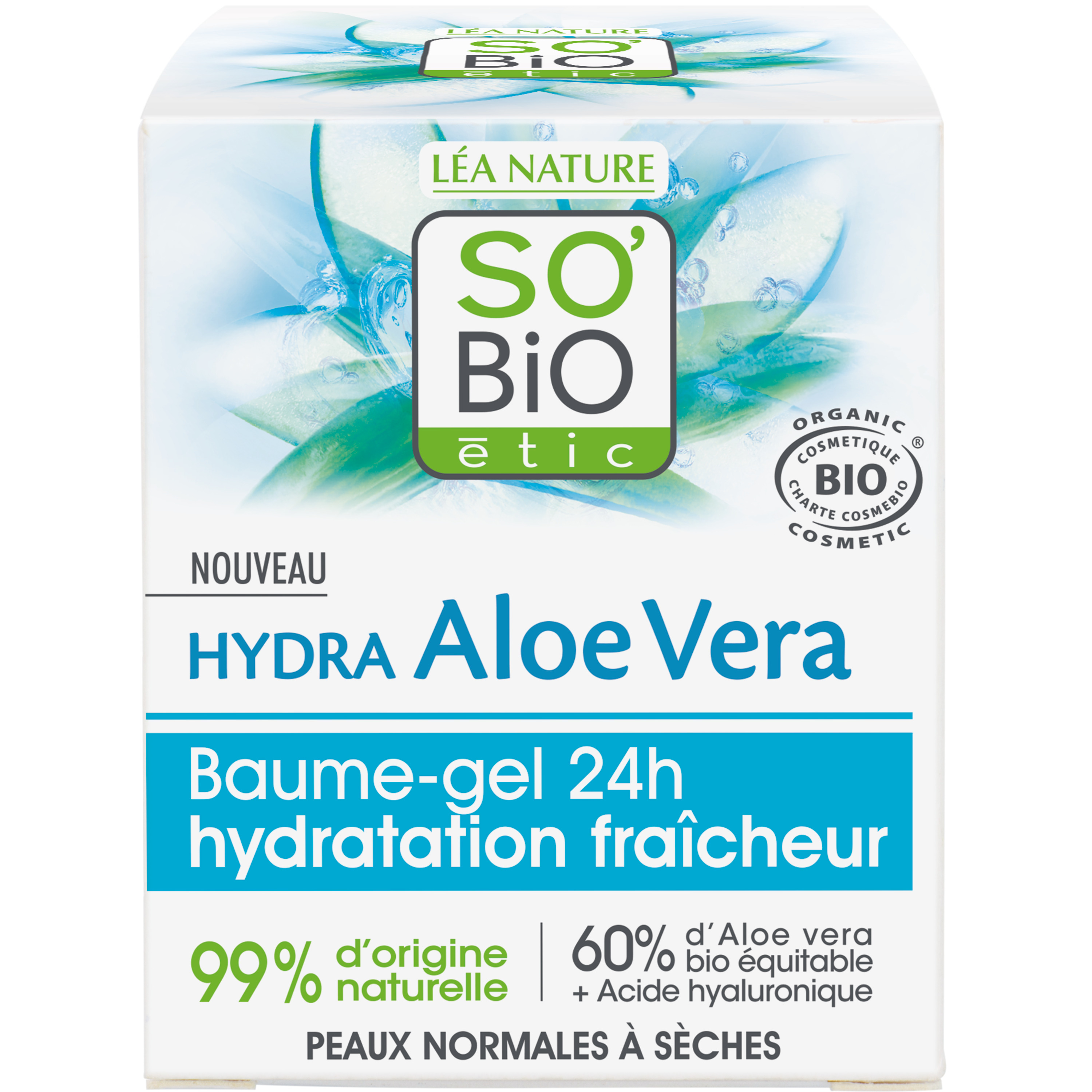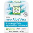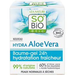SO'BiO étic® a développé des soins hautement concentrés avec 60% d'Aloe vera bio équitable et de l'Acide hyaluronique d'origine naturelle, pour une hydratation(1) fraîche et intense. BAUME-GEL HYDRATATION FRAÎCHEUR 24H, PEAUX NORMALES À SÈCHES, HYDRA ALOE VERA
