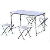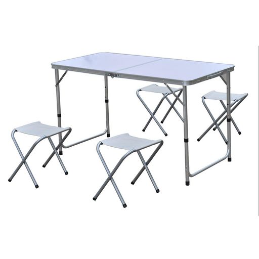 Facile à transporter et à installer, cette table pliante et ses 4 taboutret seront idéals pour une soirée camping ou un pic nic, en famille ou entre amis.