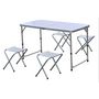 Facile à transporter et à installer, cette table pliante et ses 4 taboutret seront idéals pour une soirée camping ou un pic nic, en famille ou entre amis.FICHE TECHNIQUE- Lot qui se compose d'une table et de 4 tabourets pliants- Matière : Aluminium / Polyester- Les tabourets se rangent dans la table