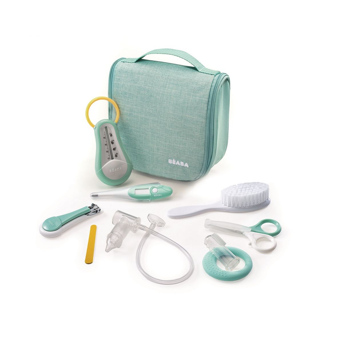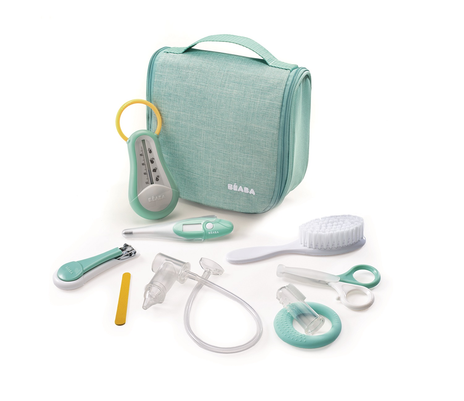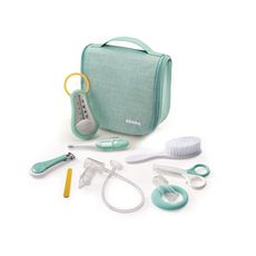 - Contient : thermomètre de bain, thermomètre digital, ciseaux, coupe-ongles, brosse à cheveux, anneau de dentition, masseur de gencives, mouche bébé manuel, lime à ongles.