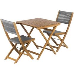 Le set bistro 2 places BARI, dans un chic coloris gris, ajoute une touche moderne a votre espace extérieur. Sa structure en bois d'acacia FSC et son revetement en corde grise allient élégance et durabilité. Avec des dimensions compactes pour les chaises (43 x 59 x 86 cm) et la table (70 x 70 x 73 cm