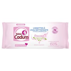 Les lingettes à l'eau nettoyante Bébé Cadum allient une eau très pure nettoyante et rafraîchissante, à l'huile d'amandes douces bio adoucissante. Leur formule, sans paraben et sans colorant est hypoallergénique** et testée cliniquement. Et toujours la composition garantie Cadum : sans paraben, sans alcool et sans colorant ! ** formulée pour minimiser les risques d'allergies Disponible en format 76 lingettes