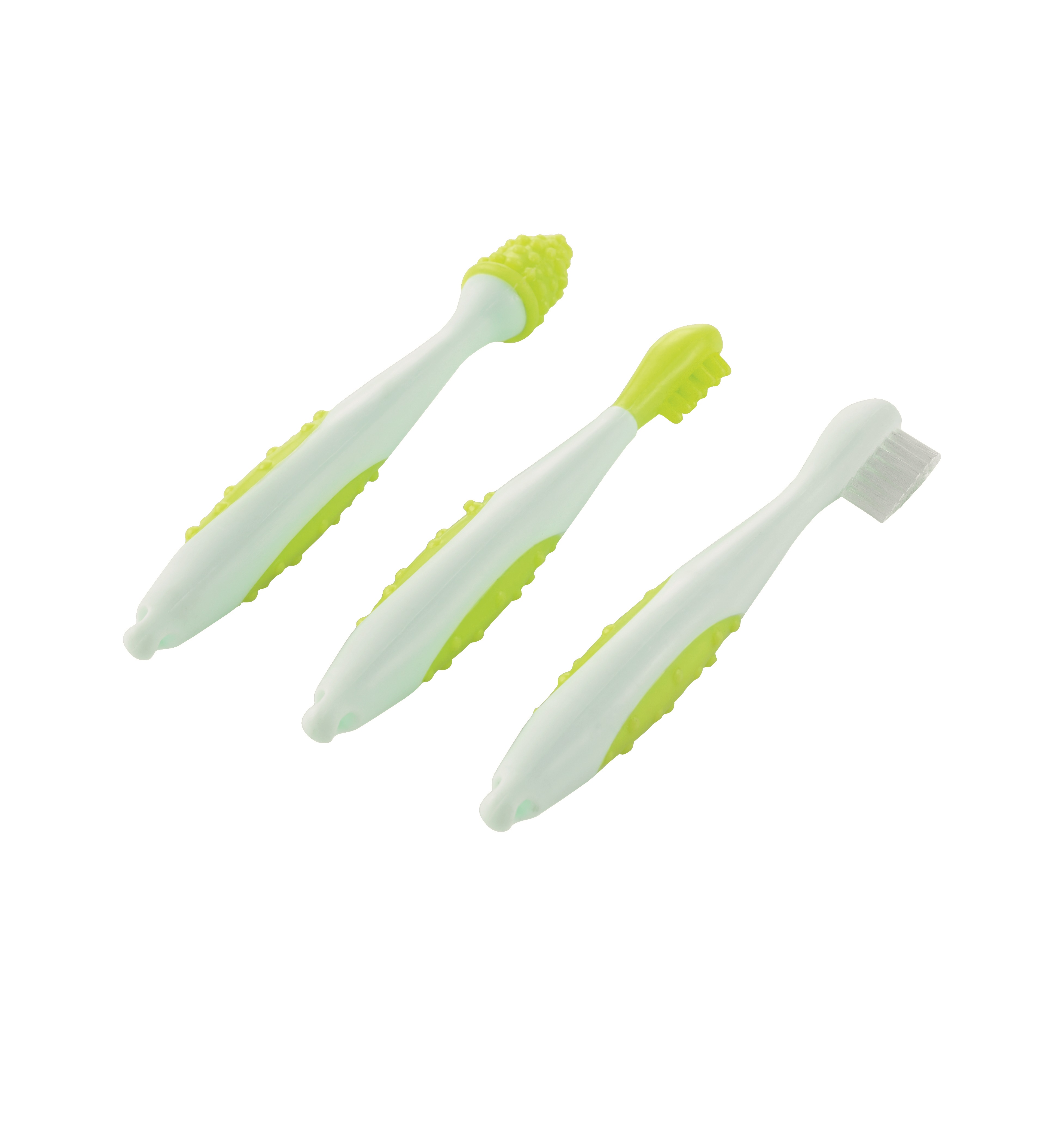Set de 3 brosses à dents conçu spécialement pour l'hygiène dentaire de bébé tout au long de sa croissance.