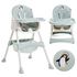 Caractéristiques :< - < - 6 mois jusqu&rsquo,à 20kg< - Les pieds de la chaise sont en acier et de petits patins anti-dérapants.< - hauteur réglable : 2 positions< - coussin en PVC &ndash, nettoyage facile et rapide< - pliage compact< - 2 modes &ndash, chaise haute bébé &ndash, chaise haute enfant< - Double plateau amovible et réglable< - Dimensions de la chaise haute : env. 62 x 77 x 92 cm (L x P x H)< - Dimensions de la petite chaise : environ 40 x 48 x 60 cm (L x P x H)< - Norme EU EN 14988:2017<
