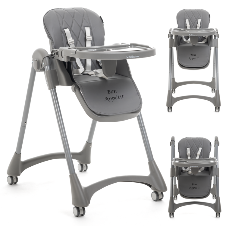 Bebelissimo - Chaise haute évolutive bébé - Pliable - Compacte - Réglable hauteur - De 6 mois à 3 ans (15kg) - gris foncé - Bon Appetit