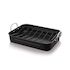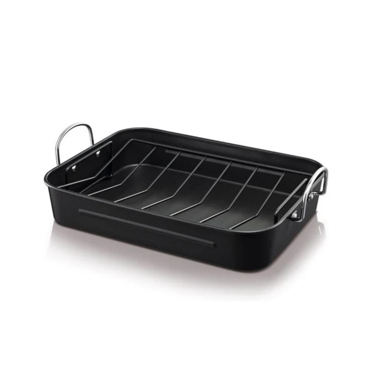 Plat à four rectangulaire 38 x 29 cm avec grille. Un plat à four multifonction en acier avec une grille anti-adhérente pratique ! La grille permet de surélever vos rôtis ou petites volailles par rapport au fond du plat afin que l'air puisse circuler librement : vos viandes sont juteuses à l'intérieur et croustillantes à l'extérieur! En acier léger (tôle d'acier) : excellente conductivité de la chaleur pour un rôtissage uniforme. Grâce à son revêtement antiadhérent intérieur, ce plat vous permettra de cuisiner au quotidien pour rôtir vos pièces de viandes ou de volailles, pour cuire vos clafoutis, vos gratins ou vos gâteaux! Revêtement extérieur et grille revêtue pour un nettoyage facilité. Poignées rivetées pour une sécurité maximale.