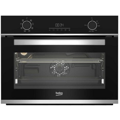 Beko BBCM13300XC Four intégrable multifonction Beko BBCM13300XC pour des parfaits résultats de cuisson. La cuisson 3D permet de cuire sur 3 niveaux différents en même temps, grâce à l'utilisation simultanée des résistances de voûte, de sole et annulaire. L'air est réparti dans toute la cavité du four de manière uniforme, sans transfert de saveur. Grâce à sa capacité de 48 litres, ce four vous offre la possibilité d'y cuire des plats volumineux. Le rail télescopique permet un accès simplifié et sécurisé aux plats.Il est désormais très facile d'enfourner et de retirer ses plats du four ! L'afficheur Maxi LED blanc est à la fois simple et intelligent. Ses touches sensitives permettent de régler la durée de cuisson ou un alarme, mais également verrouiller les touches de commandes. Les parois catalytiques permettent d'éliminer facilement toutes les projections et salissures avec une consommation électrique réduite au minimum.