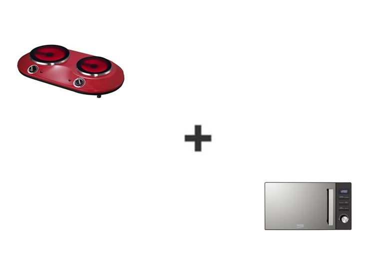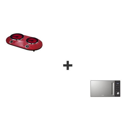 PACK : réchaud 2 Foyers de 18.5 cm et de 1200 W + micro-ondes Noir avec façade miroir, 800 W, 20 l