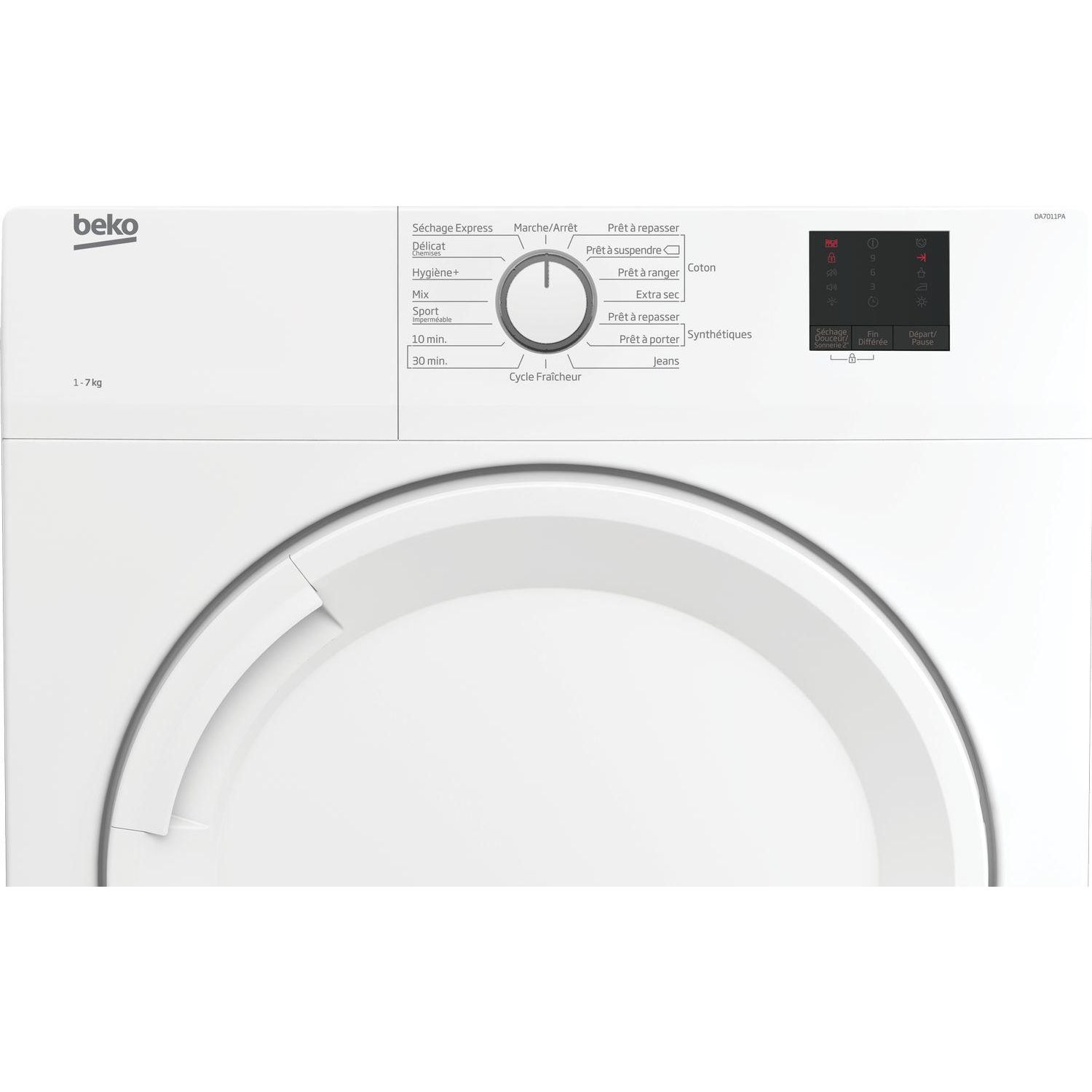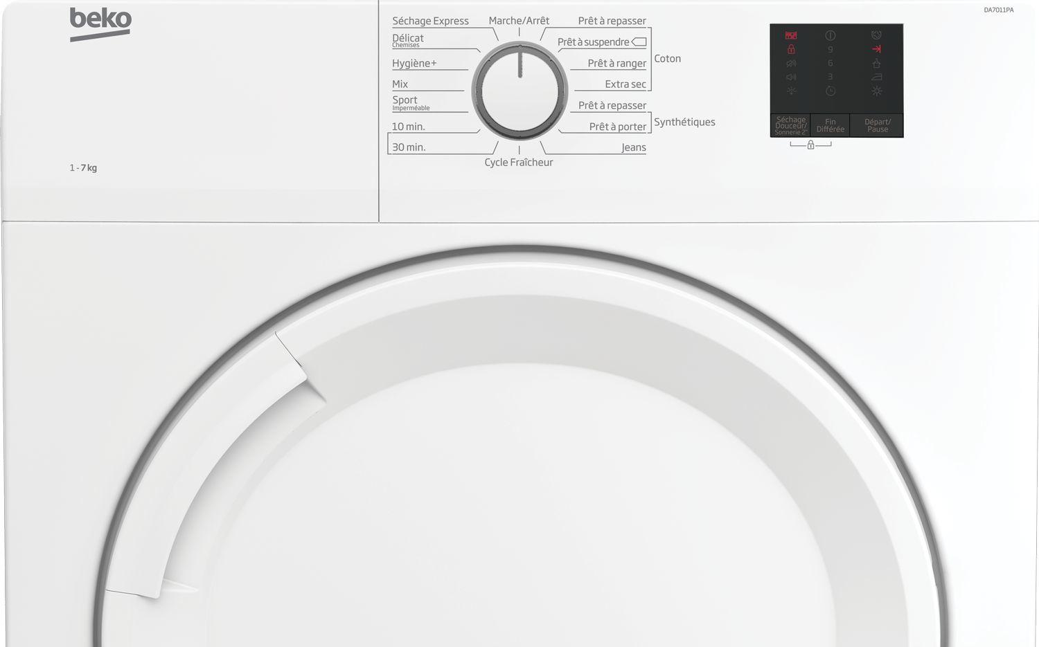 En savoir +Beko DA7011PA Sèche-linge à condensation Beko DA7011PA. Obtenez le séchage qui vous convient, évitez le froissement de votre linge, profitez du tarif heures creuses, rafraîchissez vos vêtements en 10 minutes et comprenez les programmes en un coup d'?il.Sensor :Ce sèche-linge électronique dispose d'un sensor adaptant automatiquement la durée du séchage, afin d'obtenir le résultat souhaité.Anti-froissage automatique :A la fin du séchage, si vous n'ôtez pas votre linge, l'anti-froissage automatique se déclenche. Le tambour tourne régulièrement afin d'éviter que le linge ne se froisse.Départ différé 3-6-9 heures :Grâce au départ différé 3-6-9 heures, vous pouvez mieux gérer votre emploi du temps et faire des économies en bénéficiant des tarifications heures creuses.