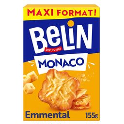 De délicieux crackers Belin Monaco à la pate extra fine et au bon emmental gratiné. Egalement disponible en format 50g et 100g selon disponibilités. Biscuits crackers.