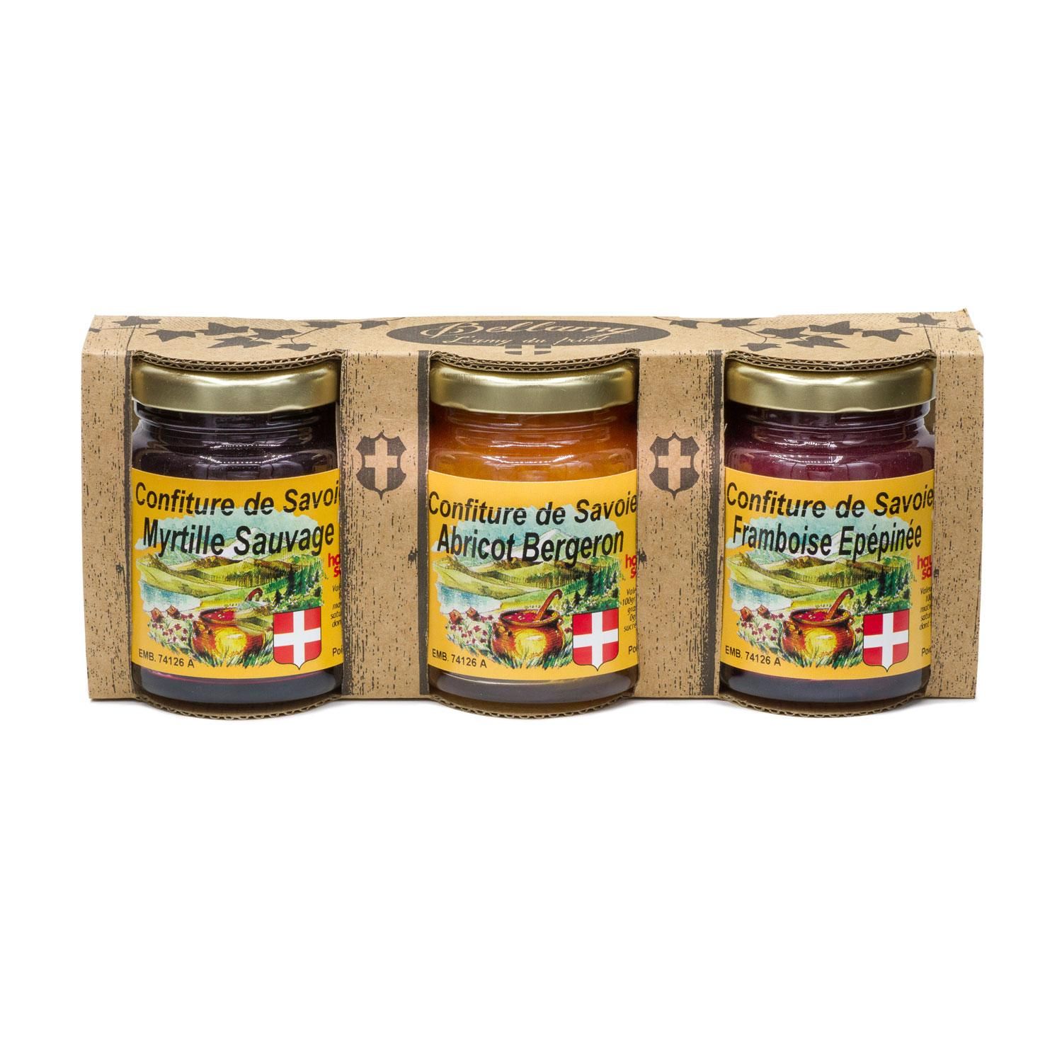 Assortiments de 3 confitures de Savoie à la myrtille sauvage abricot Bergeron et framboise Epépinée