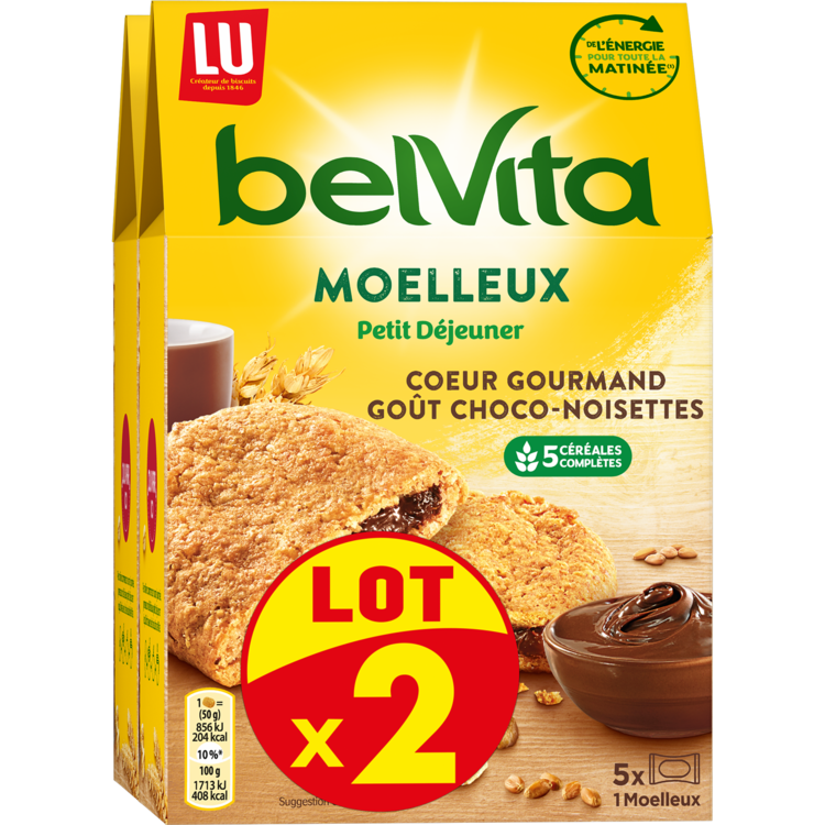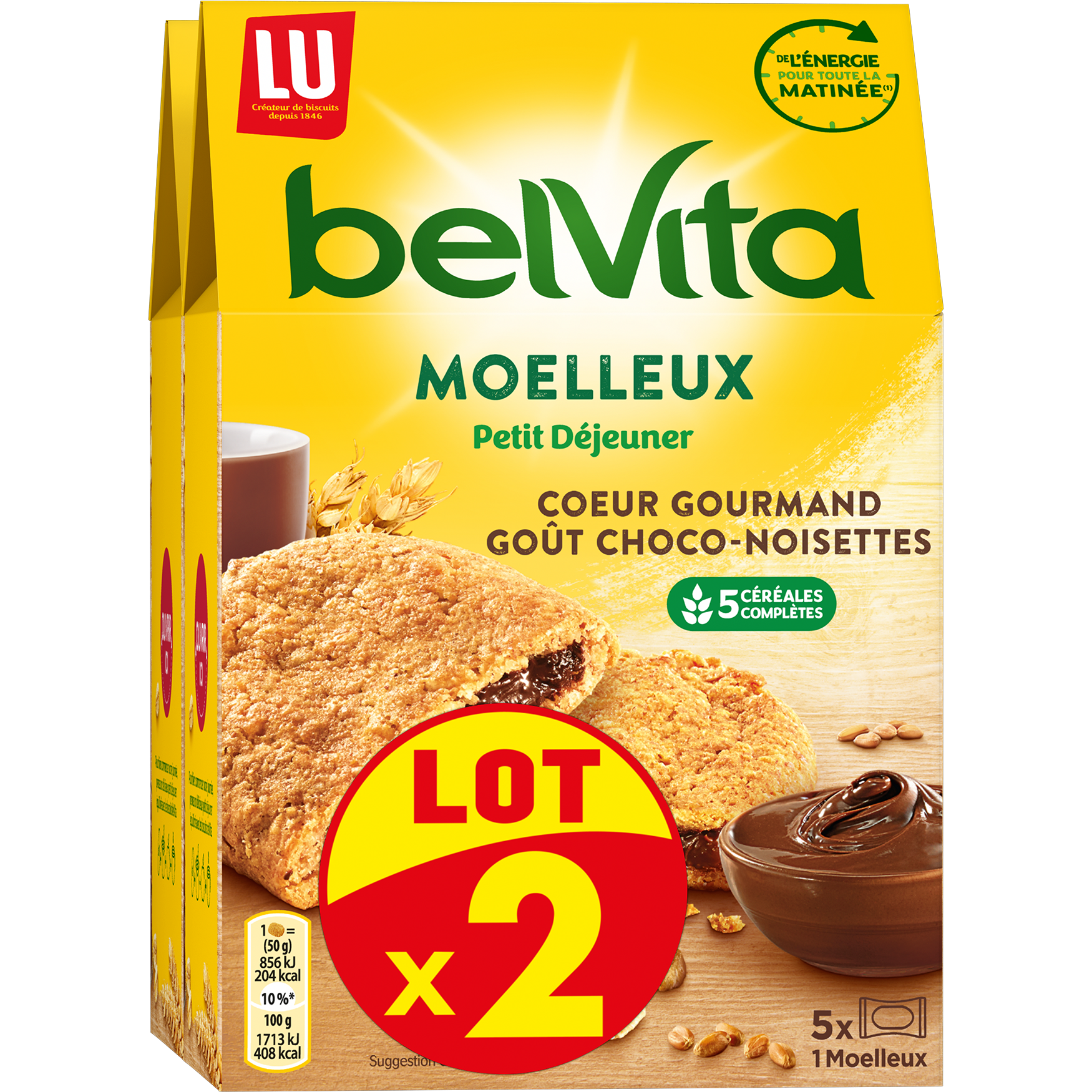 Biscuits aux céréales fourrés goût chocolat- noisette (15,6 %), enrichis en fer, en magnésium, en vitamines B6 et B9. Savourez Belvita Moelleux goût choco-noisettes au petit déjeuner : un délicieux moelleux au cœur ultra gourmand goût choco-noisettes pour démarrer la journée en douceur et en gourmandise.