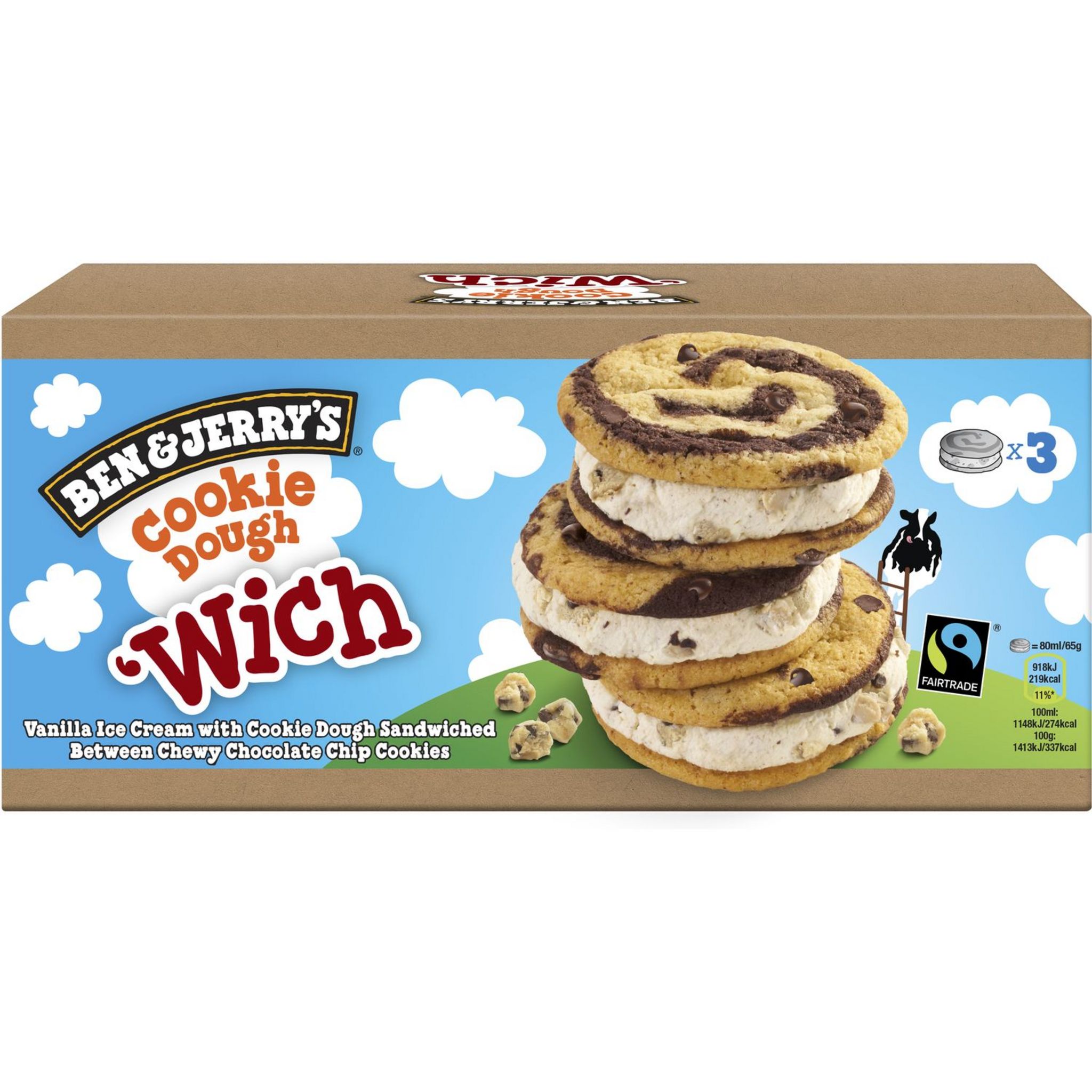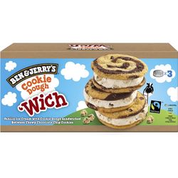 3 sandwichs glacés de 80 ml (soit 240 ml). Les ingrédients de nos crèmes glacées, comme le sucre, le cacao ou la vanille, sont issus du commerce équitable. 100% des produits Ben & Jerry's vendus en Europe sont certifiés Fairtrade Max Havelaar et Casher. A conserver à -18°C dans votre congélateur. Pour une dégustation encore plus onctueuse de votre wich Ben & Jerry’s, sortez-le quelques minutes avant de servir. Suivez notre actualité sur notre site Internet: www.benjerry.fr ou sur notre page Facebook: benjerryfr. Crème glacée vanille avec des morceaux de pâte à cookie aux pépites de chocolat (4%) entre deux cookies moelleux aux pépites de chocolat (40% dont 3% de chocolat).