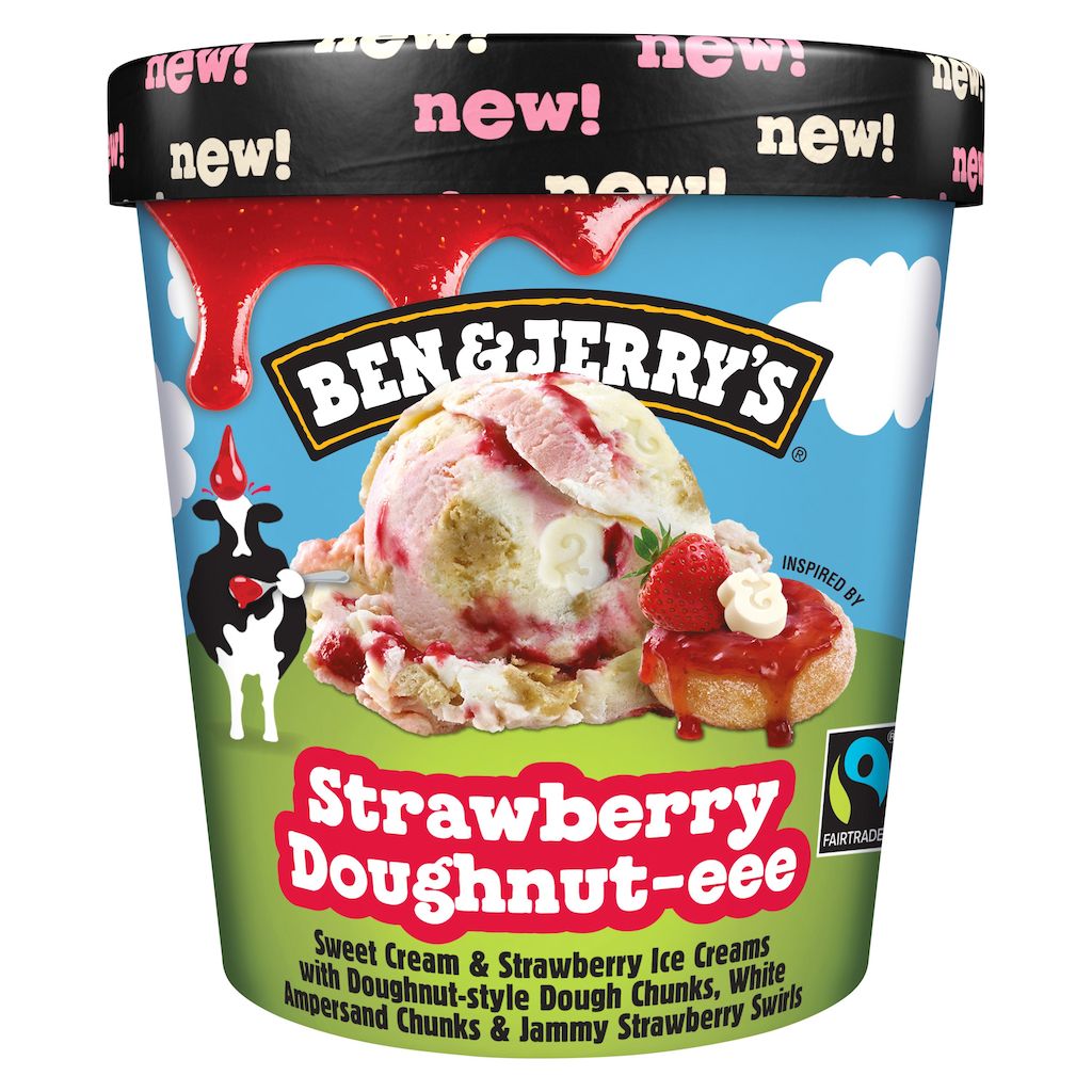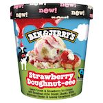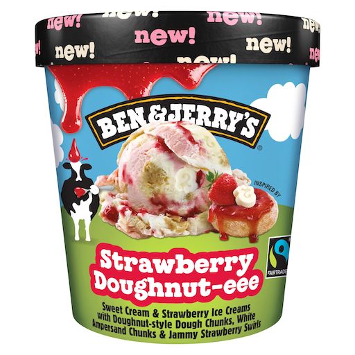Inspirés par l'expérience gourmande du doughnut fourré à la fraise, nous avons voulu recréer ce tendre souvenir d'enfance dans notre nouvelle crème glacée Strawberry Doughnut-eee. Pour encore plus de plaisir, Ben & Jerry's te propose pour la première fois 5 éléments dans une même glace en pot : une crème glacée à la fraise et une crème glacée avec des morceaux de pâte façon doughnut, des inclusions goût chocolat blanc, et des tourbillons de sauce fraise-tastique pour une touche fruitée et gourmande. Le rêve de tous les fans de doughnuts ! À chaque cuillerée, c'est comme un retour en enfance… version glacée. Fondée en 1978, l'entreprise Ben & Jerry's met aujourd'hui son enthousiasme au service de nouveaux parfums et de saveurs inédites, mais s'engage aussi à produire ses crèmes glacées de manière équitable et durable. La vision de Ben & Jerry's est simple : faire la meilleure crème glacée possible de la meilleure manière possible. C'est-à-dire proposer des crèmes glacées gourmandes tout en s'assurant que tous ceux qui participent à leur fabrication obtiennent leur juste part du gâteau. Tous les produits Ben & Jerry's (sauf la gamme vegan) contiennent des produits laitiers provenant de vaches élevées en plein air dans des fermes respectant les recommandations du Caring Dairy (production laitière équitable), et des ingrédients issus du commerce équitable. Nos produits Ben & Jerry's vendus en Europe sont certifiés Max Havelaar. Peace, Love & Ice Cream.