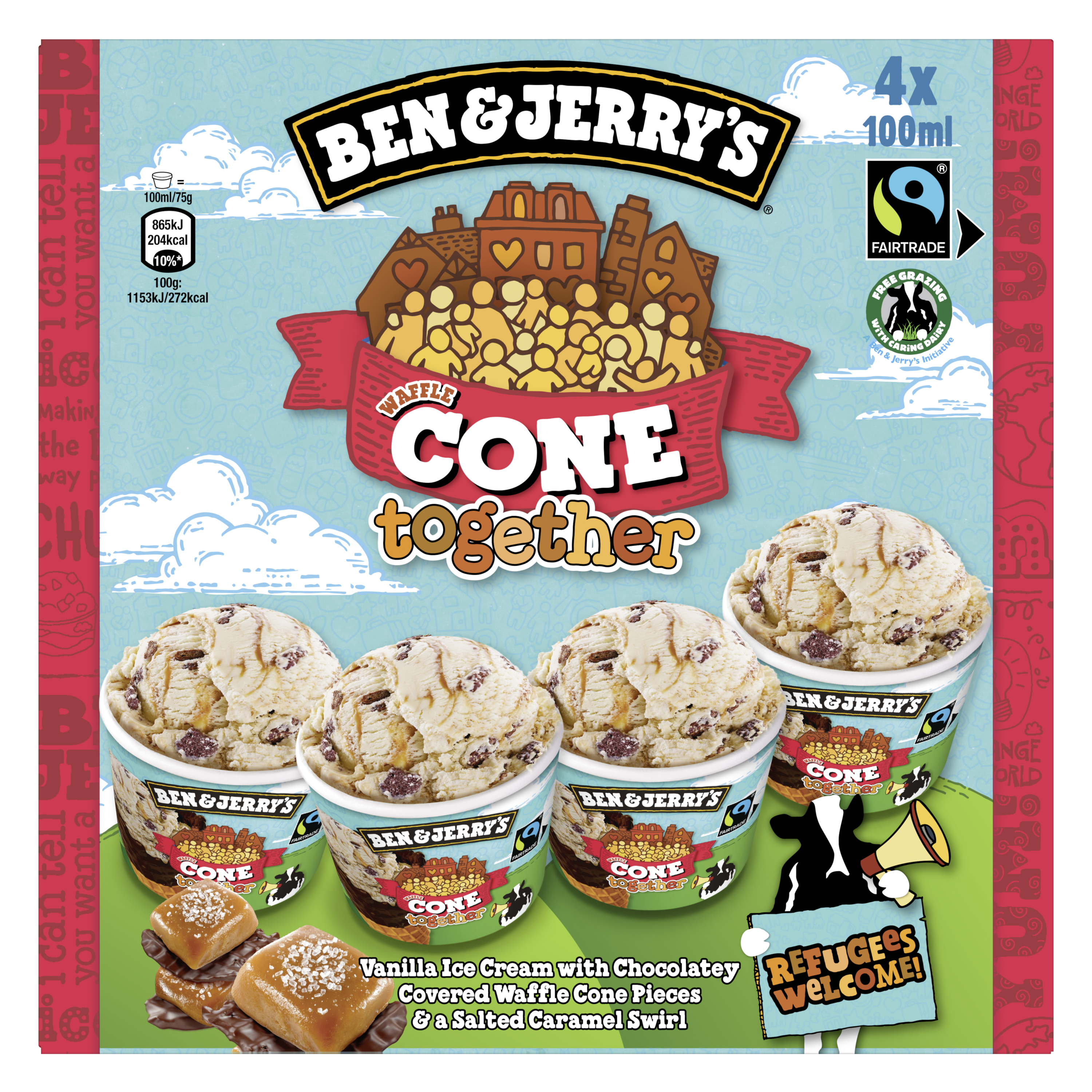 Quand de bonnes choses se rencontrent, de belles choses arrivent. Mélangez des morceaux de gaufrettes cacaotés et une généreuse sauce caramel, vous obtiendrez une glace en pot au parfum délicieux : Cone Together ! Des mini pots gourmands à partager entre amis ou en famille. Cone Together pour un monde plus accueillant. Imaginez que les gens se réunissent aussi en faveur de ceux qui en ont besoin. Ensemble, on peut faire la différence, on peut interpeller les grands de ce monde qui ont le pouvoir de protéger et de faire avancer les droits en faveur des réfugiés et demandeurs d'asile. Lorsque nous nous rassemblons, nous pouvons faire du monde un endroit délicieux. Nous sommes fiers d’apporter notre soutien à ceux qui croient que tous les humains ont des droits, sans exceptions, et que tous les réfugiés sont les bienvenus ! En réalité, trop de nos dirigeants, à travers le monde, refusent activement aux personnes cherchant l’asile les droits fondamentaux dont chacun d’entre nous a besoin. Des vies sont gâchées, des communautés entières abîmées et des familles séparées. Nos dirigeants ont le devoir de ne pas ignorer cette situation. Les personnes que nous avons élues pour nous représenter peuvent réécrire les textes de loi pour permettre à tous de participer à la vie de nos communautés et d’élever leurs enfants en sécurité. Nous pouvons déterminer qu’être un vrai leader, c’est avant tout de promouvoir un climat d’inclusion, où les gens sont traités avec respect, peu importe d’où ils viennent. En nous rassemblant, nous demandons des droits pour tous, sans exception. Ensemble, nous pouvons interpeller nos dirigeants pour qu’ils honorent les droits les personnes réfugiées et demandeuses d’asile. Une partie des bénéfices de chaque pot Cone Together de Ben & Jerry's est reversée aux ONG partenaires en Europe qui œuvrent pour le changement. Crème glacée vanille avec des morceaux de gaufrette enrobés au cacao (13%) et une sauce au caramel salé (13%).