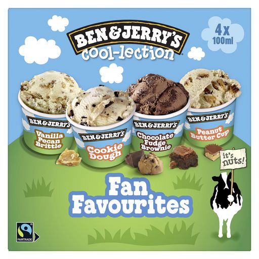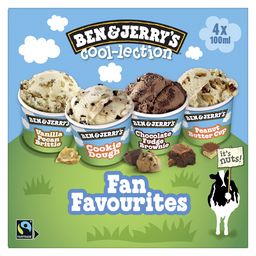 Découvre The Fan Favorite Cool-lection, 4 mini pots de crème glacée Ben & Jerry's en un seul coffret avec quatre parfums au format de 100 ml.
