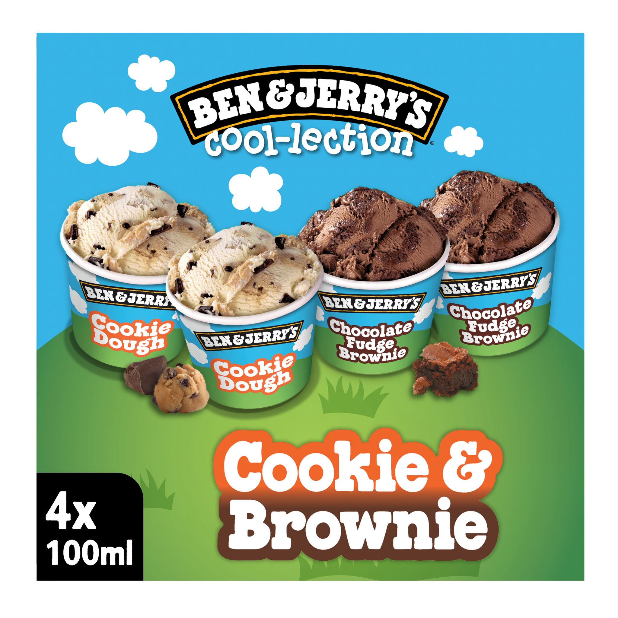 Découvre The Cookie & Brownie Cool-lections, 4 mini pots de crème glacée Ben & Jerry's en un seul coffret avec deux parfums : Cookie Dough et Chocolate Fudge Brownie en format de 100 ml.