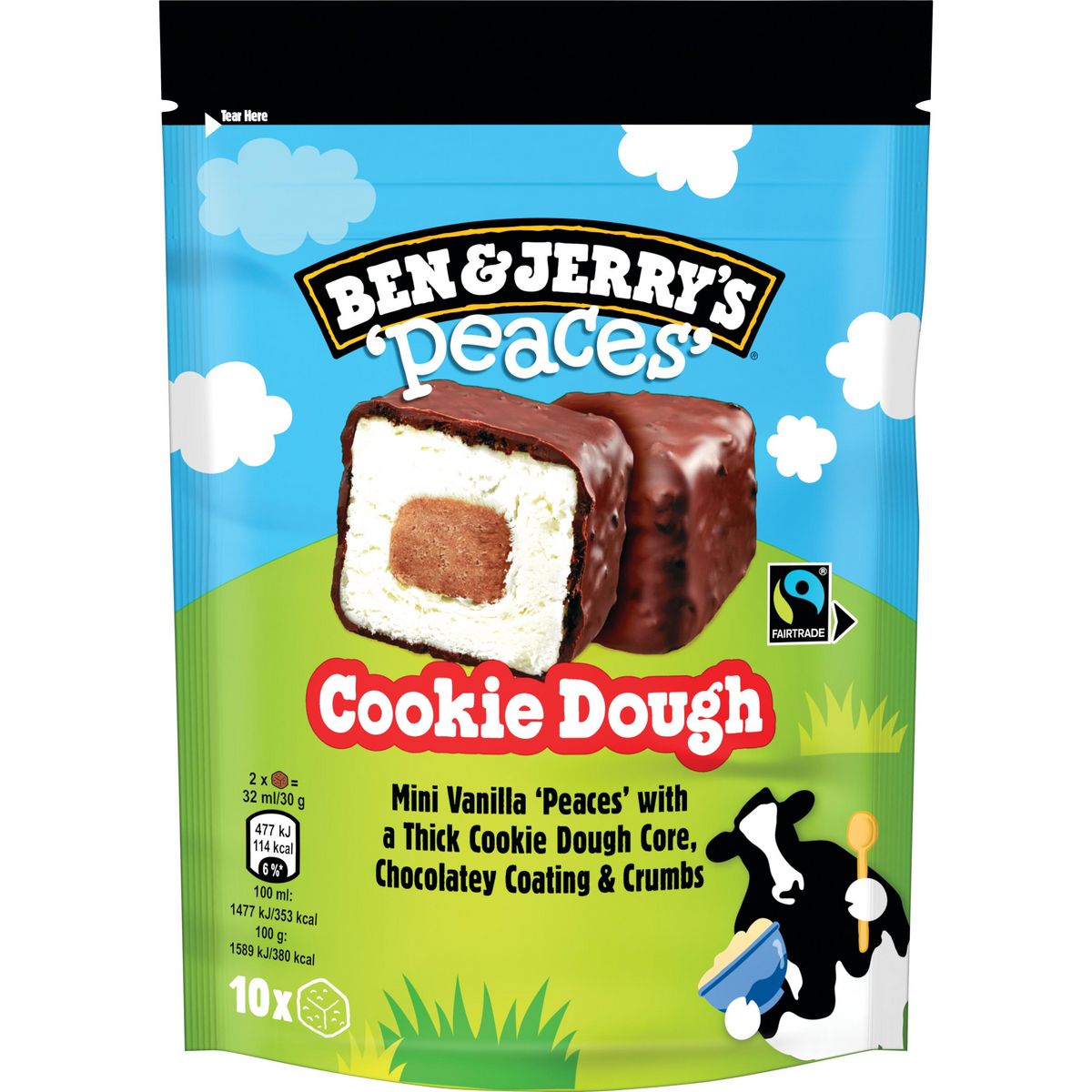 Découvre les bouchées glacées Ben & Jerry's avec un cœur de pâte de cookie, une crème glacée à la vanille et un enrobage cacaoté dans un sachet de 150 g.