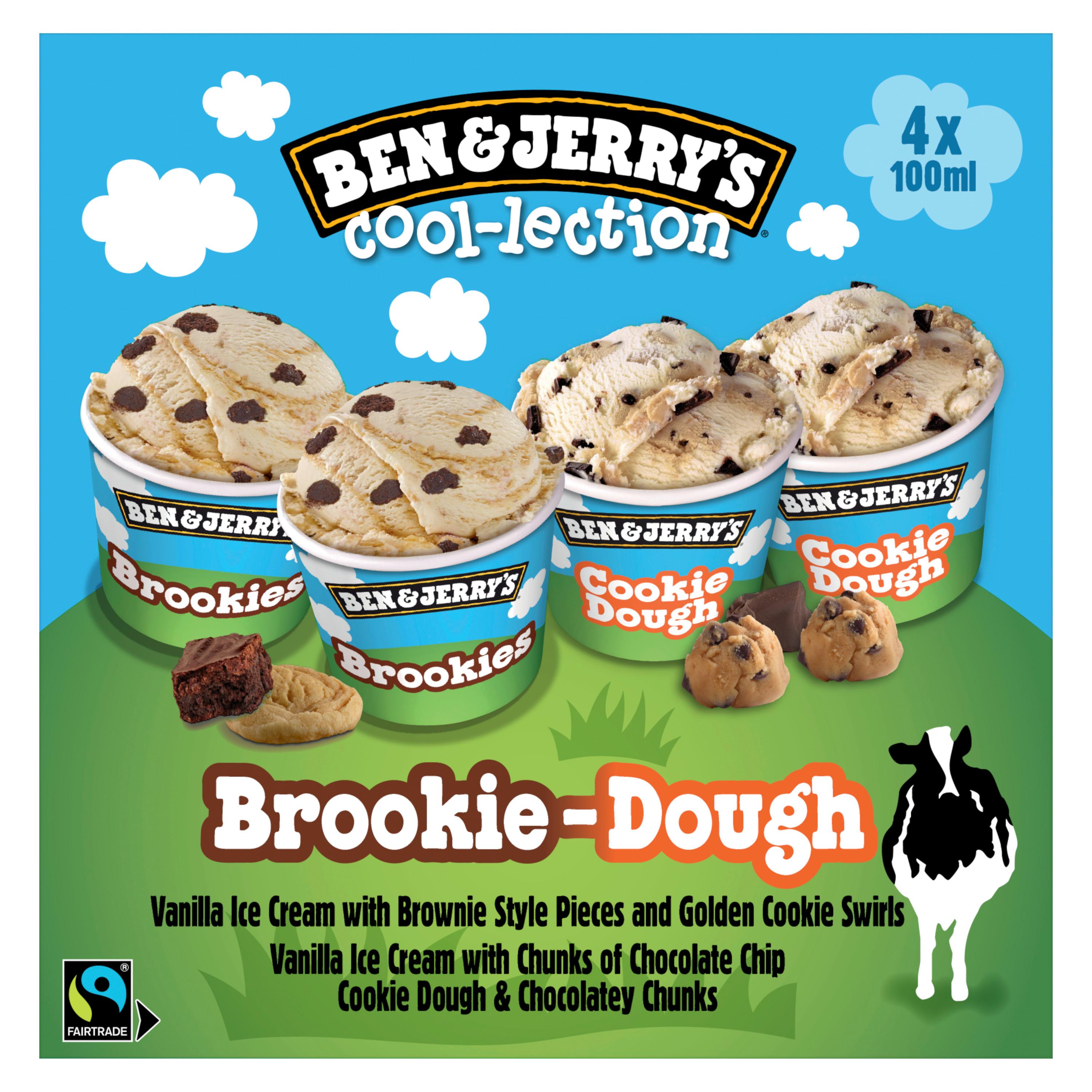 Découvre The Brookie-Dough Cool-lection, 4 mini pots de crème glacée Ben & Jerry's en un seul coffret avec deux parfums : Brookies et Cookie Dough, au format 100 ml.
