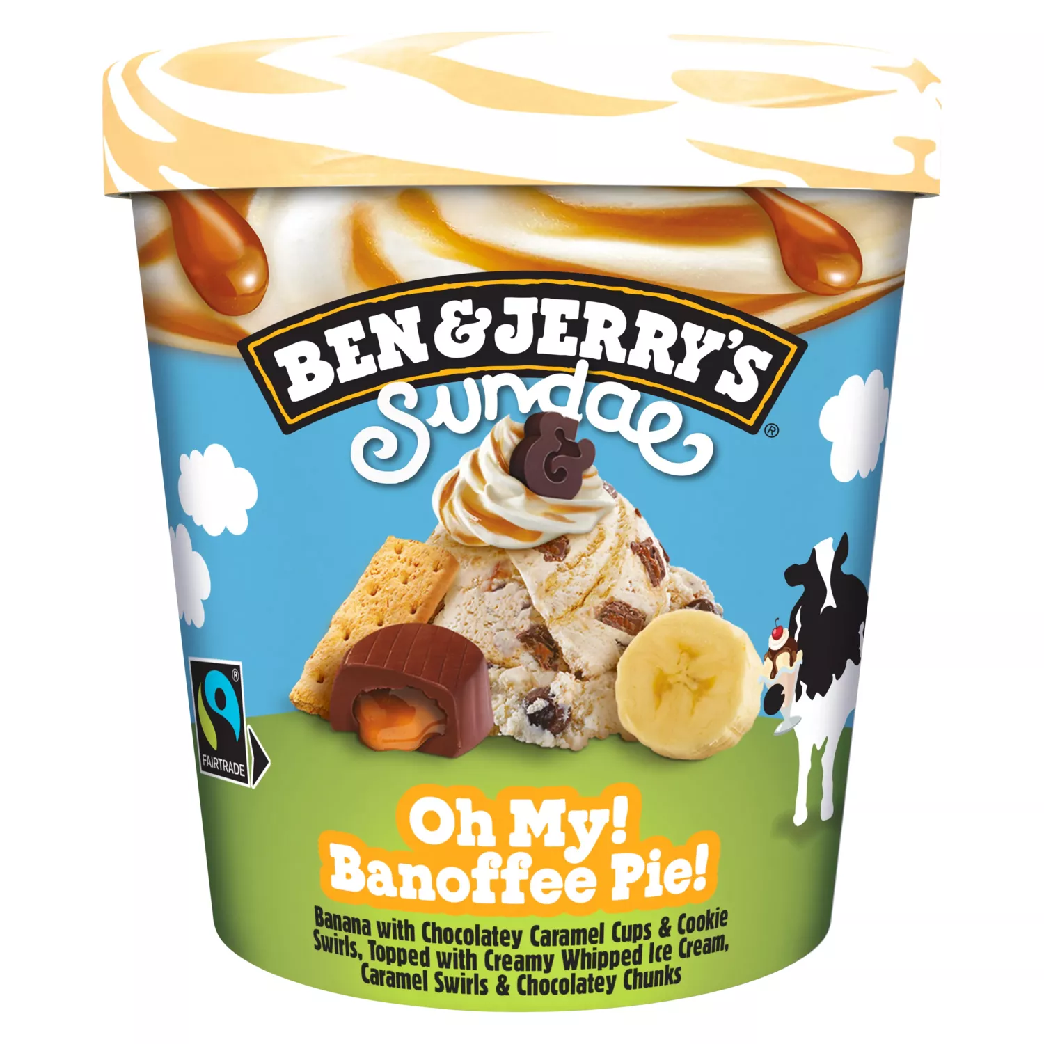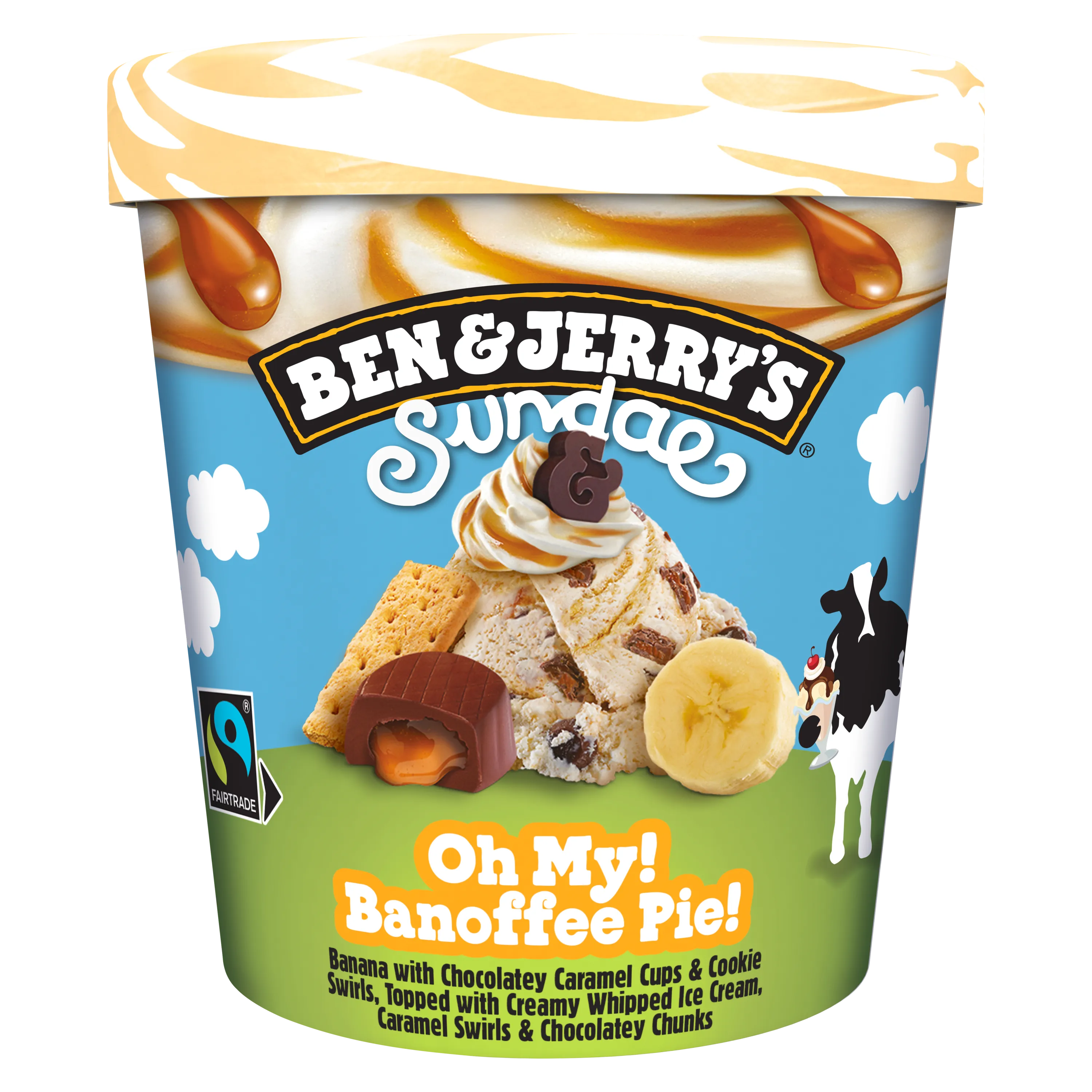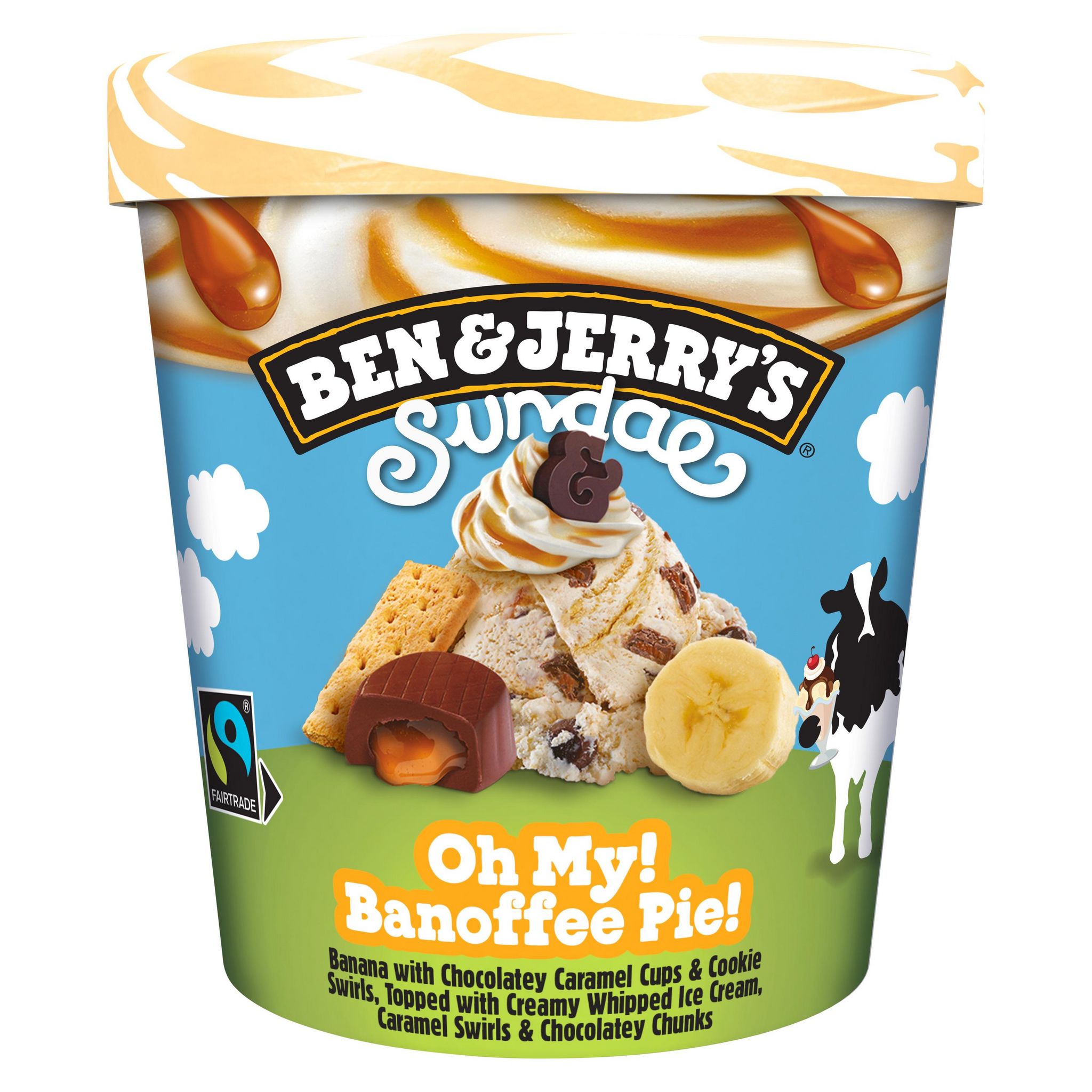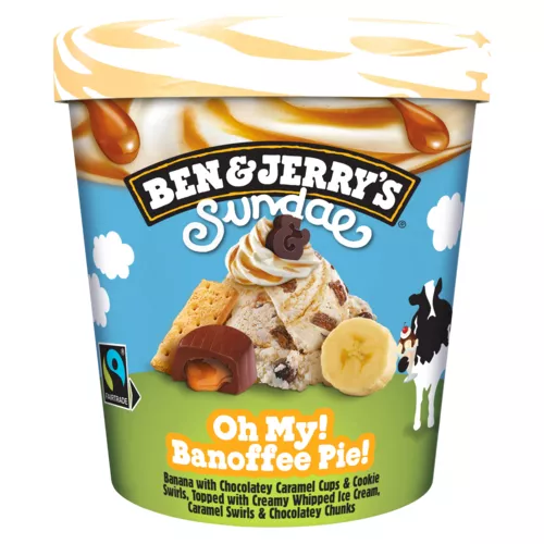 Ben & Jerry's présente la crème de la crème glacée : les Ben & Jerry's Sundaes. Découvre la glace en pot Sundae Oh My ! Banoffee Pie !, la nouvelle crème glacée à la banane de tes rêves. Une nouvelle crème glacée avec une double texture : sur le dessus, une onctueuse crème glacée fouettée et en dessous, une généreuse crème glacée avec de la banane, des caramels fondants enrobés de cacao et des tourbillons de coulis caramel. Une expérience dough-blement gourmande certifiée Commerce Équitable qui convient aux végétariens. De plus, son emballage est d'origine végétale et donc 100 % recyclable. Alors, prêt pour le nirvana de la gourmandise ? Ben & Jerry's met aujourd'hui son enthousiasme au service de saveurs inédites, créées de manière équitable et durable. Notre Philosophie Produit nous inspire pour fabriquer une crème glacée tout simplement fantastique. Tous nos produits qui contiennent des œufs et des produits laitiers proviennent de poules et de vaches élevées en plein air dans des fermes respectant les recommandations du Caring Dairy™ (production laitière équitable). Notre Philosophie Économique, c'est préférer une croissance durable afin de créer des conditions d'épanouissement pour nos employés. Enfin, Notre Philosophie Sociale est de contribuer à la prospérité mutuelle dans nos relations professionnelles. Peace, Love & Ice Cream.