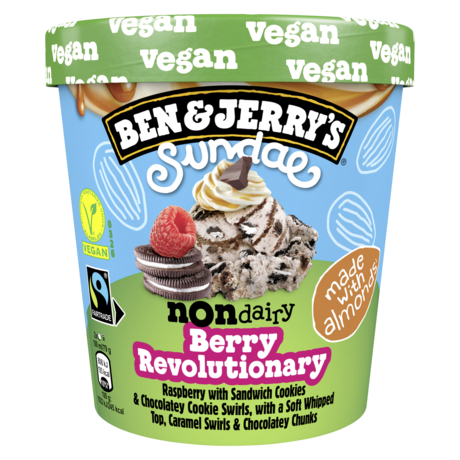 Dans cette recette vegan Ben & Jerry's Berry Revolutionnary, il y a tout – sauf des produits laitiers ! Une glace en pot avec une double texture contenant du bon lait d’amande : sur le dessus, une onctueuse glace fouettée et en dessous, une généreuse glace à la framboise avec de délicieux biscuits au cacao fourrés et des tourbillons de coulis cookie. Une expérience dough-blement gourmande certifiée Commerce Équitable qui convient aux végétariens. De plus, son emballage est d’origine végétale et donc 100 % recyclable. Alors, prêt pour le nirvana de la gourmandise ? De la station essence rénovée à Burlington, dans le Vermont, jusqu’aux contrées lointaines aux noms imprononçables, l'entreprise qu'a créé nos 2 amis en 1978, est devenue légendaire. Ben & Jerry’s met aujourd'hui son enthousiasme au service de saveurs inédites, créées de manière équitable et durable. Notre Philosophie Produit nous inspire pour fabriquer une crème glacée tout simplement fantastique. Tous nos produits qui contiennent des œufs et des produits laitiers proviennent de poules et de vaches élevées en plein air dans des fermes respectant les recommandations du Caring Dairy™ (production laitière équitable). Notre Philosophie Économique, c’est préférer une croissance durable afin de créer des conditions d’épanouissement pour nos employés. Enfin, Notre Philosophie Sociale est de contribuer à la prospérité mutuelle dans nos relations professionnelles. Peace, Love & Ice Cream.