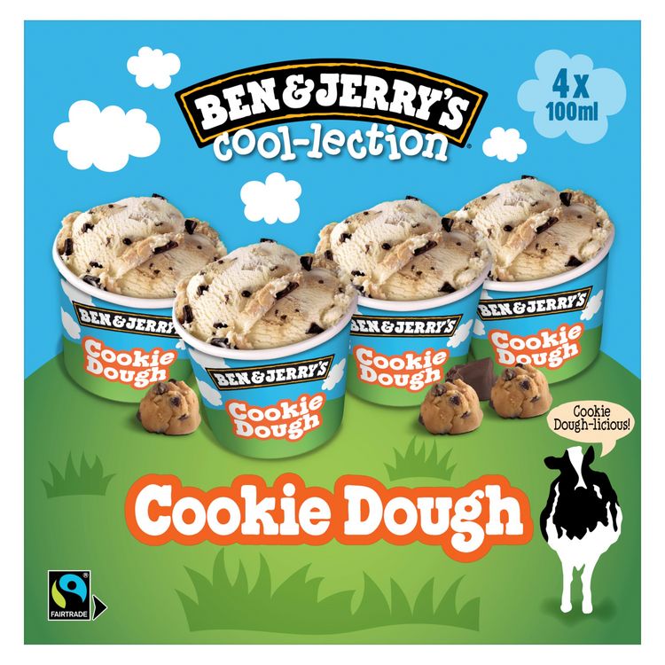 Célébrez les 30 ans de notre légendaire Cookie Dough avec The Cookie Dough Cool-lection ! Un multipack de 4 mini-pots de Cookie Dough : une crème glacée vanille avec des morceaux de pâte à cookie aux pépites de chocolat et des inclusions cacaotées. En 1986, sur les conseils d'un fan, nous avons incorporé de la pâte à cookie dans nos glaces, une idée révolutionnaire ! Les morceaux de cookies étaient si gros que cela posait des problèmes à nos machines. Après 5 ans de recherche et développement, le problème a été complètement résolu ! Essayez également les autres références de notre Cool-lection, telles que la glace en pot The Cookie & Brownie Cool-lection, The Fan-Favourites Cool-lection ou encore The Chunks Cool-lection. Fondée en 1978, l'entreprise Ben & Jerry's met aujourd'hui son enthousiasme au service de nouveaux parfums et de saveurs inédites, mais s'engage aussi à produire ses crèmes glacées de manière équitable et durable. La vision de Ben & Jerry's est simple : faire la meilleure crème glacée possible de la meilleure façon possible. C'est à dire proposer des crèmes glacées gourmandes tout en s'assurant que tous ceux qui participent à leur fabrication obtiennent leur juste part du gâteau. Tous les produits Ben & Jerry's contiennent des œufs et produits laitiers provenant de poules et de vaches élevées en plein air dans des fermes respectant les recommandations du Caring Dairy (production laitière équitable), et des ingrédients issus du commerce équitable. Nos produits Ben & Jerry's vendus en Europe sont certifiés Fairtrade Max Havelaar et Kasher. Peace, Love & Ice Cream.