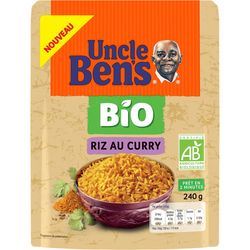Riz complet bio étuvé délicatement précuit à la vapeur et cuisiné avec des épices et une touche de curcuma. Riz curry cuisson express 2 min au micro-ondes ou 3 min à la poêle Uncle Ben's. Savourez notre riz curry bio, délicatement cuit à la vapeur et préparé avec un mélange d’épices aromatiques indiennes. Précuit avec des produits de qualité pour un repas délicieux en seulement quelques minutes. À déguster en famille et entre amis dès aujourd'hui !