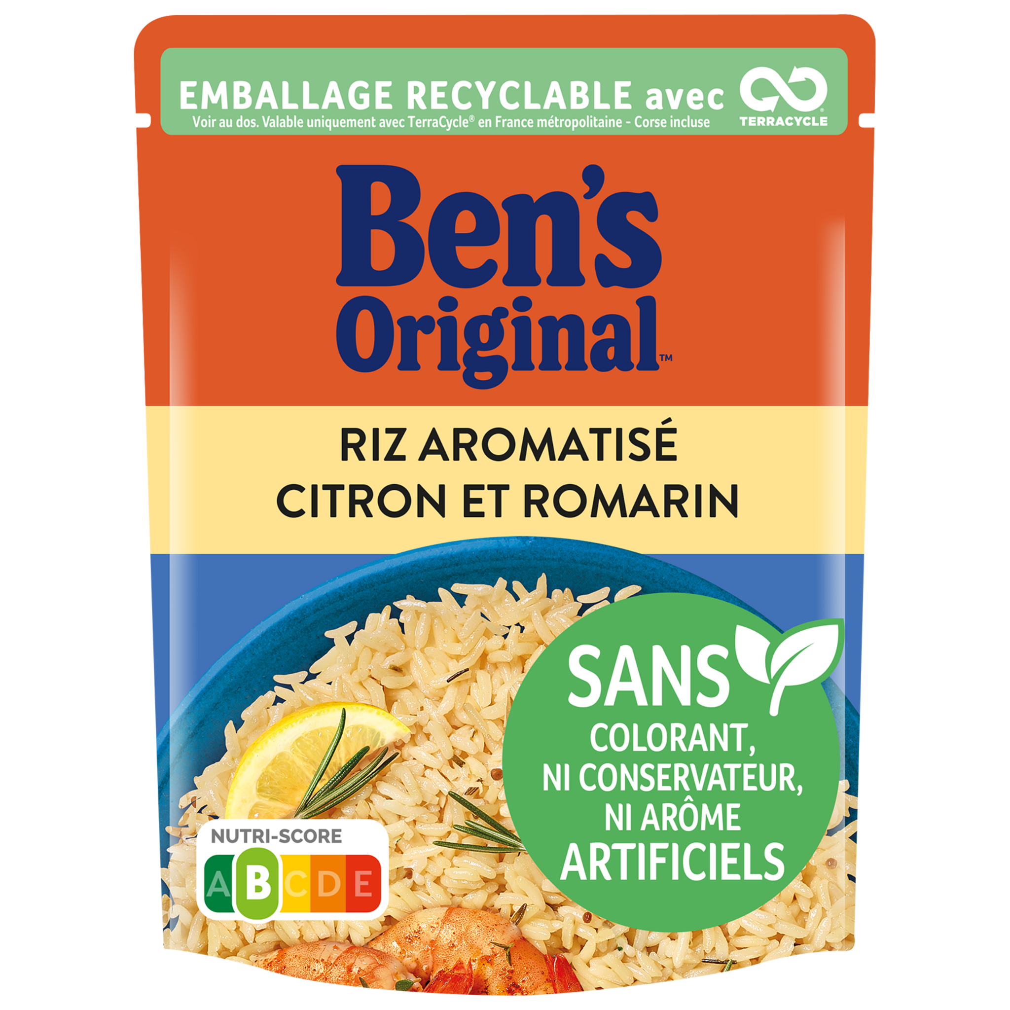 Le riz au Citron et Romarin BEN'S ORIGINAL’s™ est lentement précuit à la vapeur, cuisiné avec des zests de citron, du romarin et des graines de moutarde. Il agrémentera parfaitement vos recettes au poisson et notamment au saumon. Savoureux, inratable et rapide à préparer en 2 minutes, en micro-ondes ou à la poêle. Il est sans colorant, ni conservateur, ni arôme artificiels. Nutriscore B Note Yuka : 75/100