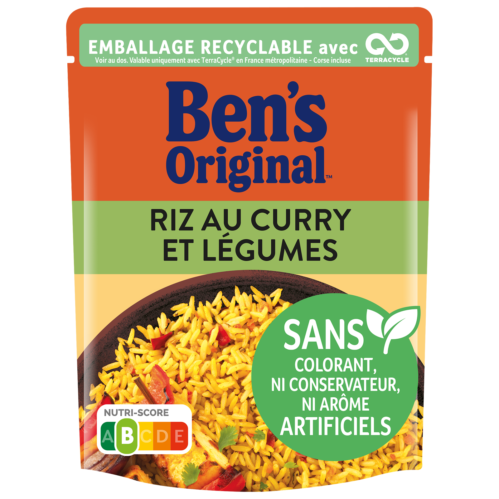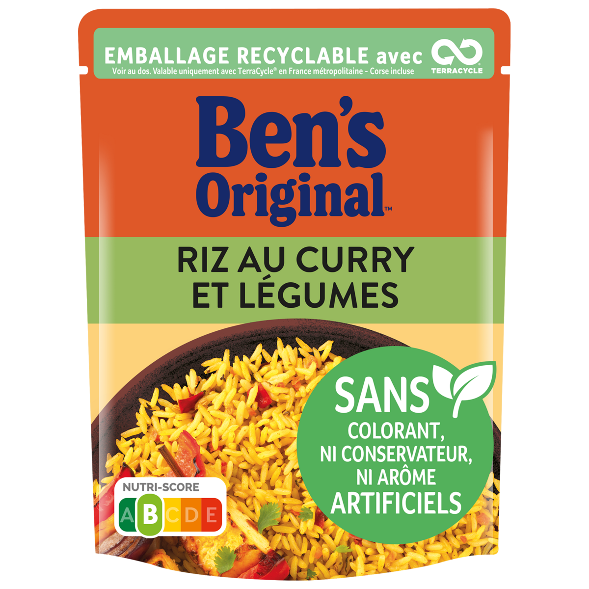 Le riz au Curry et Légumes BEN'S ORIGINAL’s ™ est un riz long grain lentement précuit à la vapeur cuisiné avec des carottes, des épinards et un mélange d’épices indiennes. Donnez à votre plat une touche orientale ! Savoureux, inratable et rapide à préparer en 2 minutes, en micro-ondes ou à la poêle. Il est sans colorant, ni conservateur, ni arôme artificiels. Nutriscore B Note Yuka : 75/100