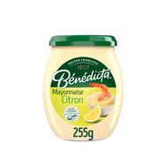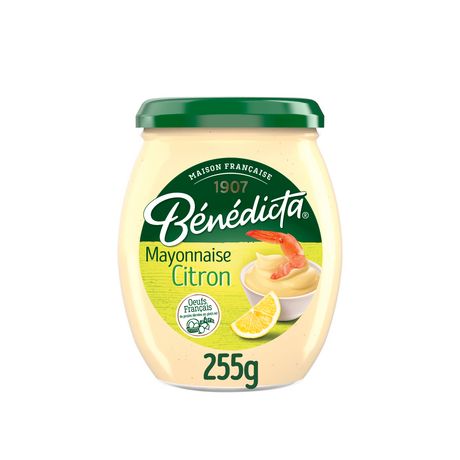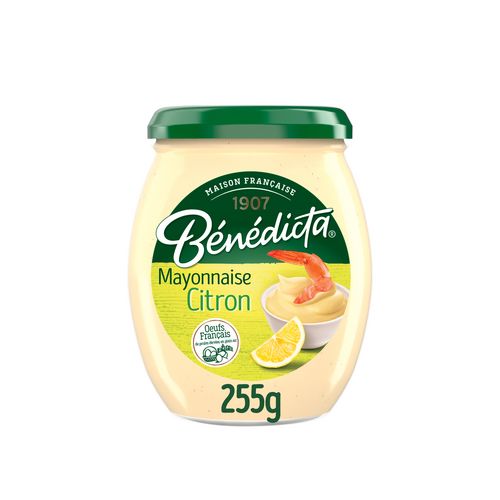 Découvrez la mayonnaise citron Bénédicta. Le goût fin et délicat d'une mayonnaise à la française subtilement associé aux notes acidulées du citron. Cette mayonnaise légèrement acidulée aux saveurs estivales sera parfaite pour agrémenter vos plats de poissons ou vos crudités. Au-delà de sa délicatesse légendaire, la mayonnaise a le pouvoir extraordinaire de se marier avec tous vos plats préférés ! De l'incontournable œuf mayo à la célèbre frite de pomme de terre, en passant par les crustacés, c'est la mayonnaise qui sublime vos repas comme aucune autre. Depuis 1907, la Maison Bénédicta élabore ses créations gourmandes avec passion à Seclin, dans les Hauts de France, en sélectionnant ses ingrédients avec soin. Chez Bénédicta, nous sommes fiers de cultiver le bon depuis le premier jour. Cette mayonnaise est disponible en bocal au format 255g.
