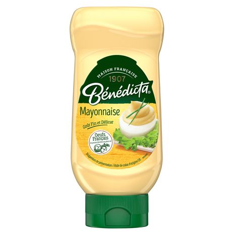 "Découvrez la mayonnaise Nature Bénédicta. Le goût fin et délicat d'une mayonnaise à la française, qui relèvera tous vos plats. Au-delà de sa délicatesse légendaire, la mayonnaise a le pouvoir extraordinaire de se marier avec tous vos plats préférés ! De l'incontournable œuf mayo à la célèbre frite de pomme de terre, en passant par les crustacés, c'est la mayonnaise qui sublime vos repas comme aucune autre. Depuis 1907, la Maison Bénédicta élabore ses créations gourmandes avec passion à Seclin, dans les Hauts de France, en sélectionnant ses ingrédients avec soin. Chez Bénédicta, nous sommes fiers de cultiver le bon depuis le premier jour. Cette mayonnaise est disponible en bocal au format 255g, 510g et 640g en flacon souple au format 235g et 400g et en tube de 180g."