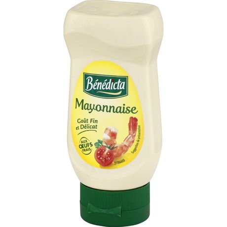 Mayonnaise Le goût fin et délicat de la Mayonnaise Bénédicta aux œufs frais révèle toute la saveur de vos plats ! Sa consistance onctueuse et veloutée habille délicatement les mets les plus variés : crudités, viandes ou poissons.