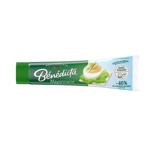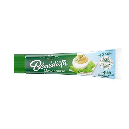 Découvrez la mayonnaise légère Bénédicta. Le goût fin et délicat d'une mayonnaise à la française allégée en matières grasses. Mayonnaise allégée de 46% en matières grasses par rapport à une mayonnaise classique du marché. La mayonnaise qui vous fera fondre de plaisir est forcément chez Bénédicta. Au-delà de sa délicatesse légendaire, la mayonnaise a le pouvoir extraordinaire de se marier avec tous vos plats préférés ! De l'incontournable œuf mayo à la célèbre frite de pomme de terre, en passant par les crustacés, c'est la mayonnaise qui sublime vos repas comme aucune autre. Depuis 1907, la Maison Bénédicta élabore ses créations gourmandes avec passion à Seclin, dans les Hauts de France, en sélectionnant ses ingrédients avec soin. Chez Bénédicta, nous sommes fiers de cultiver le bon depuis le premier jour. Cette mayonnaise est disponible en tube de 180g."