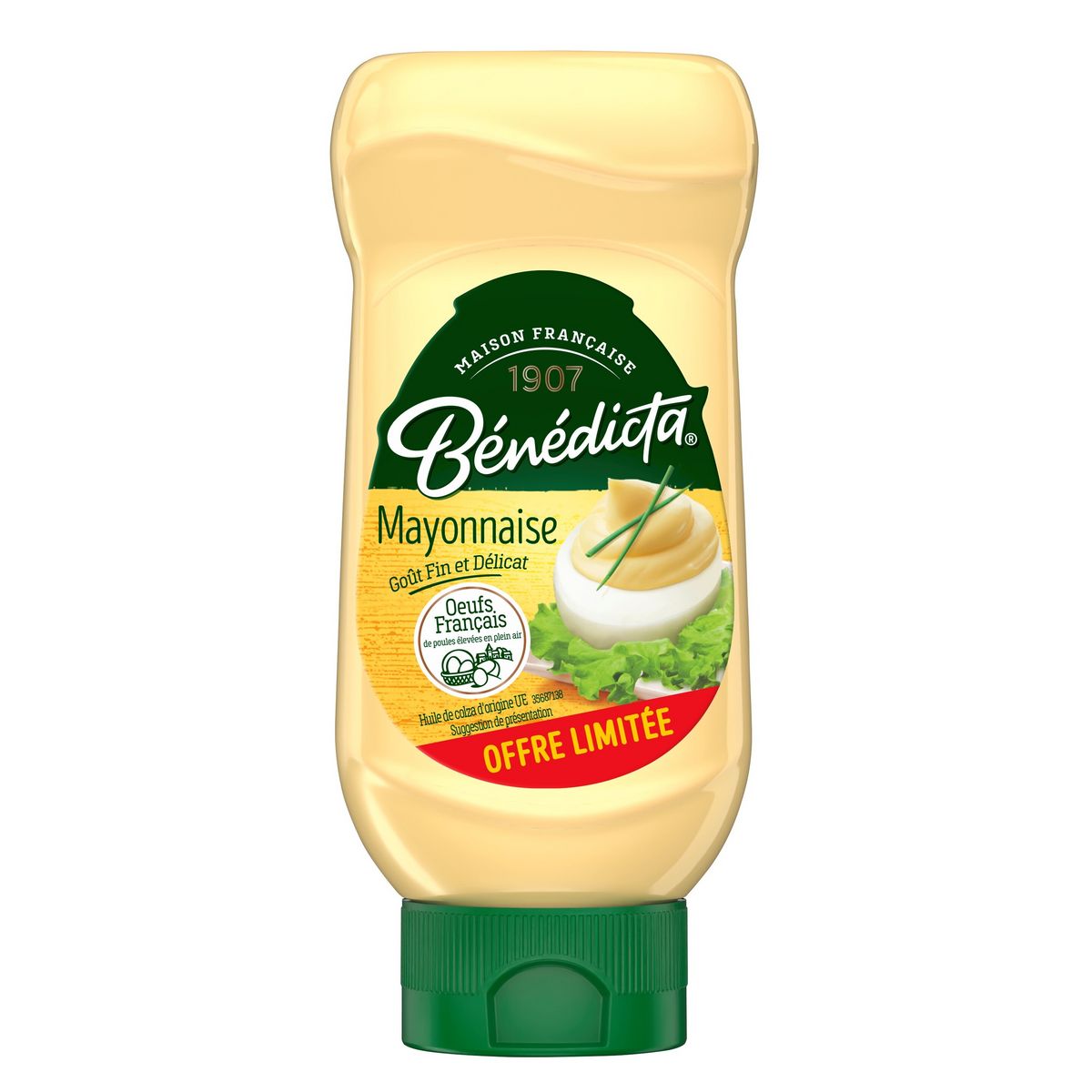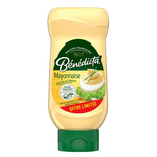Ingrédients: Huile de colza 69%, eau, MOUTARDE de Dijon 5,9% (eau, graines de MOUTARDE, vinaigre d'alcool, sel), jaunes d'ŒUFS de poules élevées en plein air pasteurisés 5%, vinaigres (vinaigre d'alcool, vinaigre de vin blanc), jus de citron à base de concentré, sel, amidon modifié, épaississant : gomme xanthane, sucre, arômes, colorant : bêta-carotène.