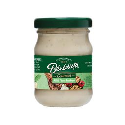 Ingrédients: Huile de colza, eau, fromage blanc 5% (lait), jaunes d'oeufs pasteurisés 4,5%, vinaigre d'alcool, sucre, ail 1,6%, sel, amidon modifié, fines herbes 0,35% (ciboulette, persil), acidifiant : acide lactique, poivre blanc, arôme, conservateur : sorbate de potassium, oignon, antioxydant : E385. Ce produit peut contenir des traces de moutarde.