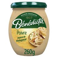 "Découvrez la sauce Poivre de Madagascar Bénédicta. La force du poivre de Madagascar dans son expression la plus simple saura rehausser toutes vos viandes ou vos légumes. Découvrez toute notre gamme de sauces culinaires Bénédicta, des sauces indispensables pour vos repas et vos moments de partage entre amis ou en famille. Depuis 1907, la Maison Bénédicta élabore ses créations gourmandes avec passion à Seclin, dans les Hauts de France, en sélectionnant ses ingrédients avec soin. Chez Bénédicta, nous sommes fiers de cultiver le bon depuis le premier jour. Cette sauce est disponible en bocal au format 260g."