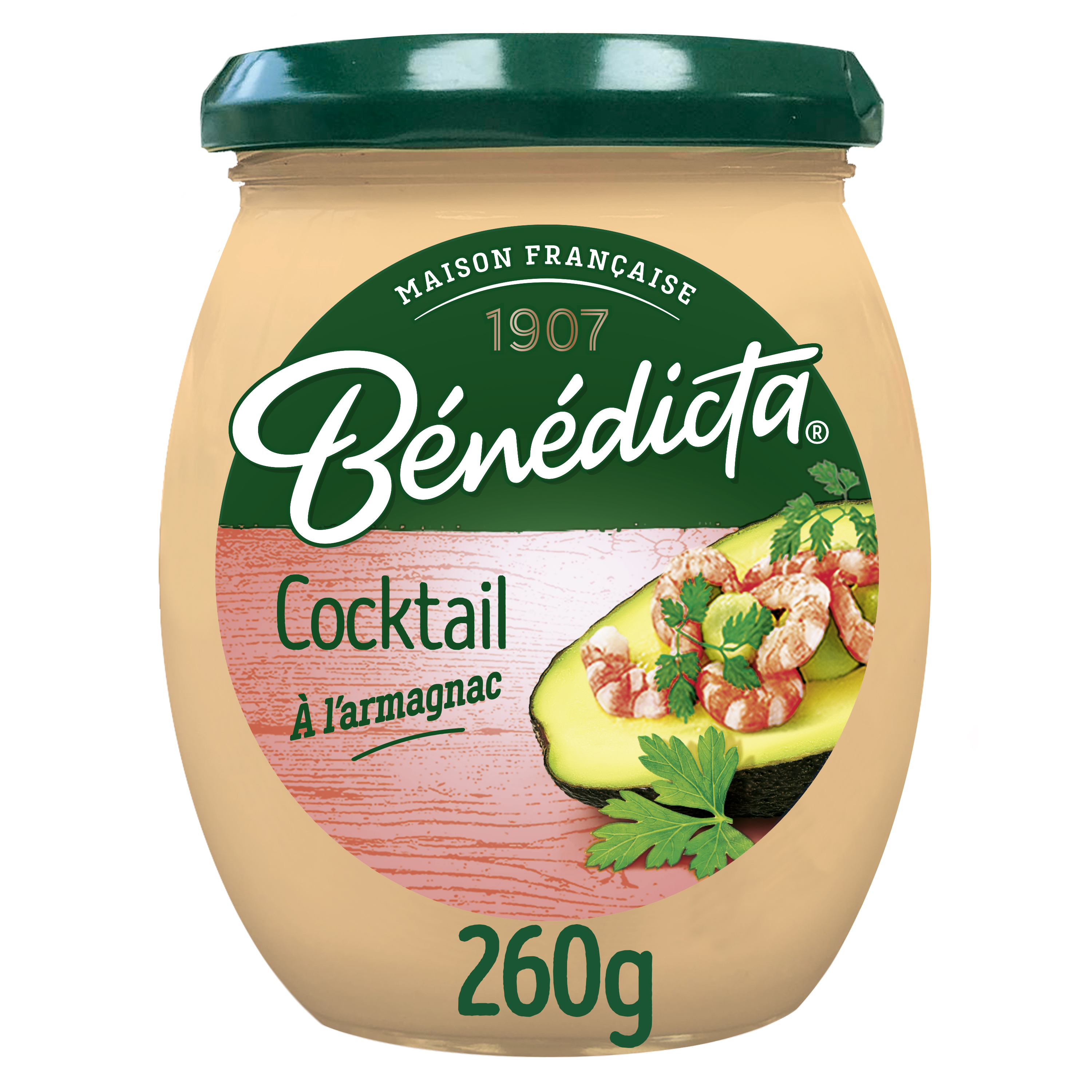 "Découvrez la sauce Cocktail Bénédicta. Le caractère de l'Armagnac associé à la douceur de la tomate pour rehausser avec saveur vos entrées froides ou vos apéritifs. Découvrez toute notre gamme de sauces culinaires Bénédicta, des sauces indispensables pour vos repas et vos moments de partage entre amis ou en famille. Depuis 1907, la Maison Bénédicta élabore ses créations gourmandes avec passion à Seclin, dans les Hauts de France, en sélectionnant ses ingrédients avec soin. Chez Bénédicta, nous sommes fiers de cultiver le bon depuis le premier jour. Cette sauce est disponible en bocal au format 260g."