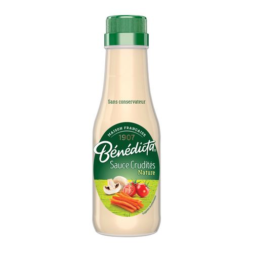 "Découvrez la sauce crudité nature Bénédicta. Que diriez-vous d'accompagner vos crudités, salades, et viandes froides avec une délicieuse sauce crudités nature ? Avec Bénédicta, gourmandise et touche d'onctuosité seront au rendez-vous dans l'assiette. Notre sélection de sauces ravira toutes celles et ceux qui aiment se faire plaisir. Depuis 1907, la Maison Bénédicta élabore ses créations gourmandes avec passion à Seclin, dans les Hauts de France, en sélectionnant ses ingrédients avec soin. Chez Bénédicta, nous sommes fiers de cultiver le bon depuis le premier jour. Cette sauce est disponible en flacon en verre au format 290g et 735g."