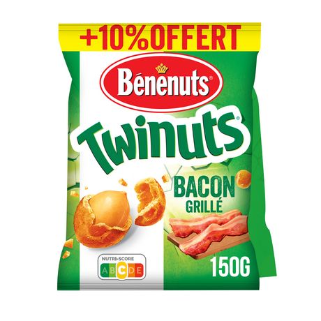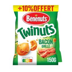 Ingrédients : CACAHUÈTES ( 40%), farine de riz, amidon (de maïs, BLÉ), huile de tournesol, sucre, base aromatisante bacon grillé [farine de riz, poudre de PETIT-LAIT, sel, sucre, oignon en poudre, extrait de levure, arômes naturels (dont LAIT), maltodextrine fumée, sel fumé, ail en poudre, acidifiant (acide citrique)], sel, chlorure de potassium, colorants (rouge de betterave, curcumine). Peut contenir : SOJA, MOUTARDE, différents types de FRUITS À COQUE.