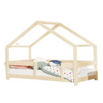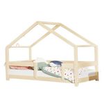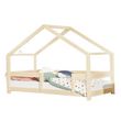 Lit montessori en bois massif de 90 x 190 cm, avec barrière de sécurité. Ce lit en forme de cabane donnera à la chambre de votre enfant de l'originalité !