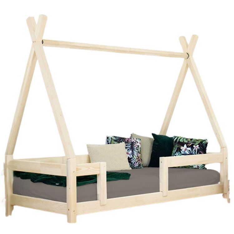 Les lits Benlemi ont un design sobre et élégant qui s'intègre parfaitement à la décoration de la chambre de l'enfant. Contenu : Lit simple en bois NAKANA forme tipi avec barrière de sécurité - non verni - 90 x 200 cm. Dimensions : 99x171x209cm