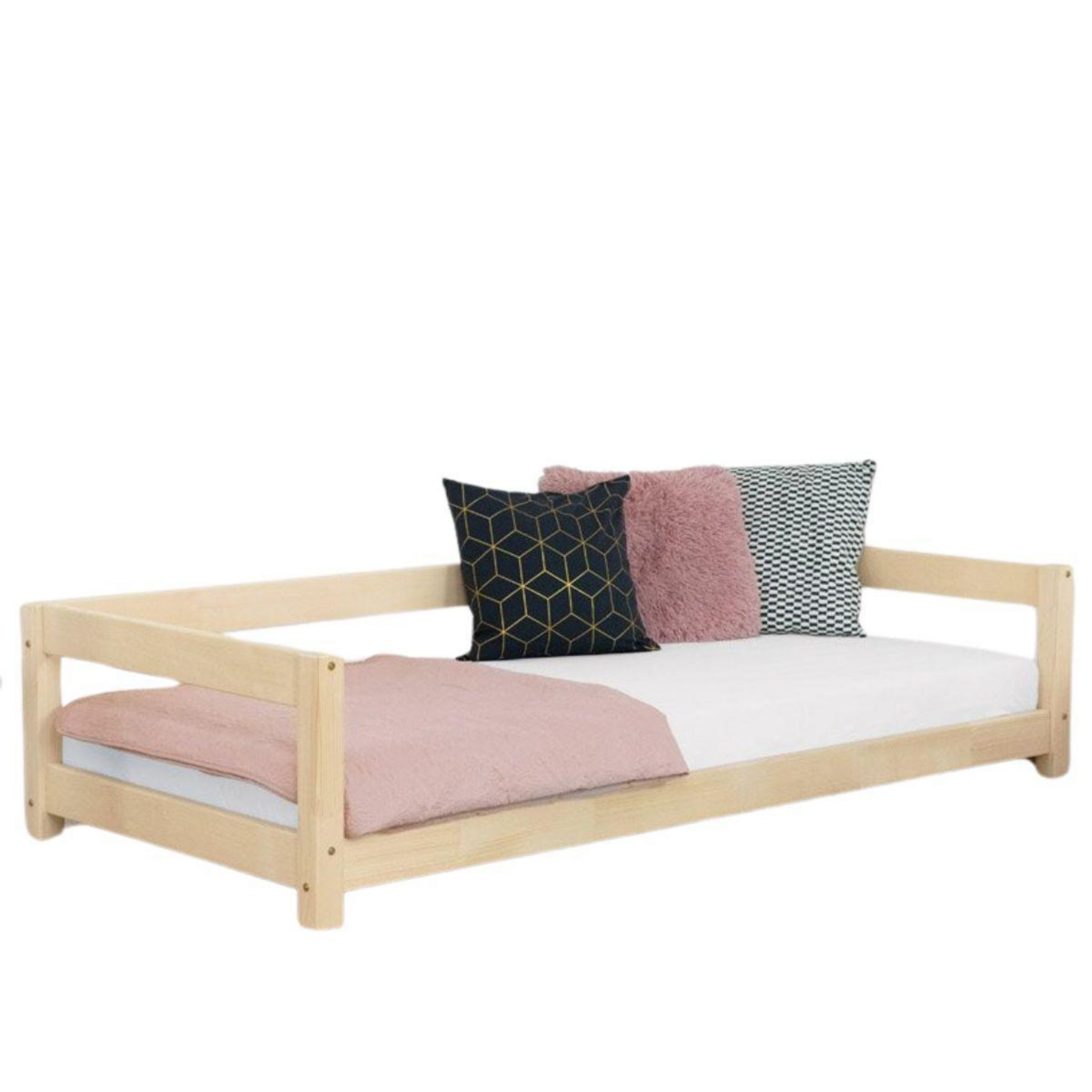 Un lit simple avec renforts en bois sur trois côtés adapté aux enfants, adolescents comme aux adultes.