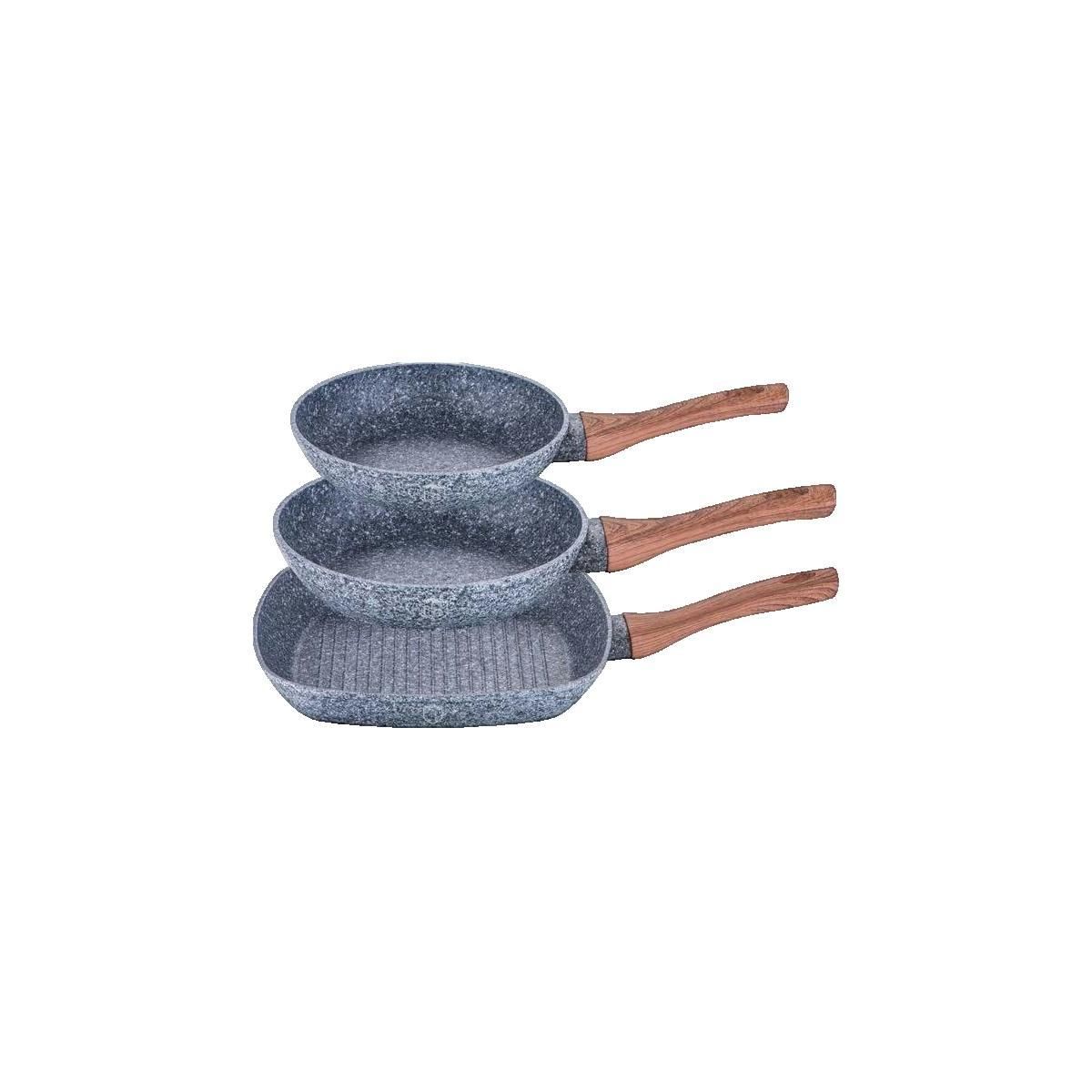 La batterie de cuisine Forest Line de Berlinger-Haus comprend 3 poêles conçues pour une cuisson saine et efficace : une poêle à frire de 20 cm (1,0 L), une poêle à frire de 24 cm (1,7 L) et une poêle à griller de 28 cm (2,1 L). Fabriquées en aluminium forgé léger avec un revêtement granit-marbre tri