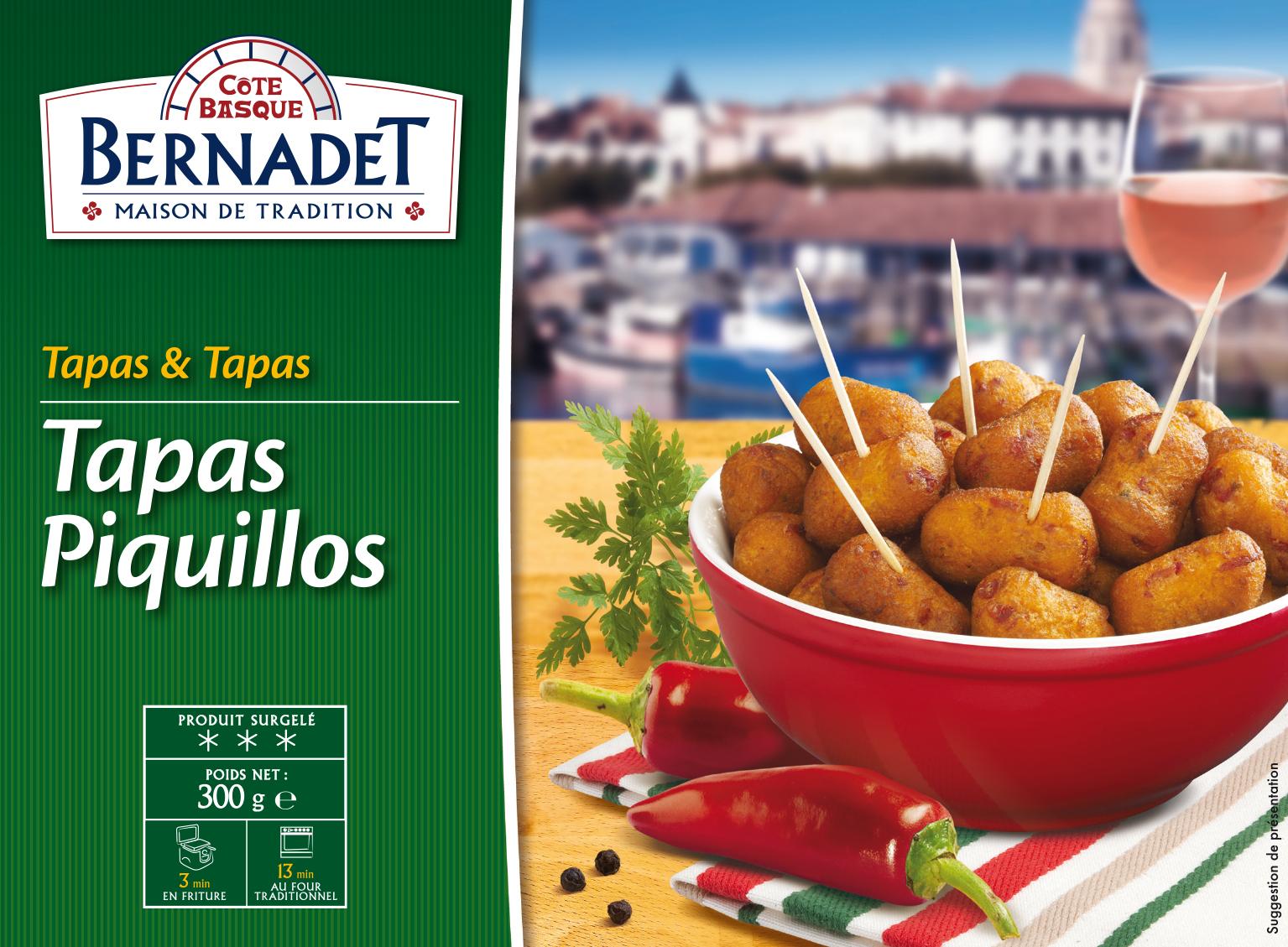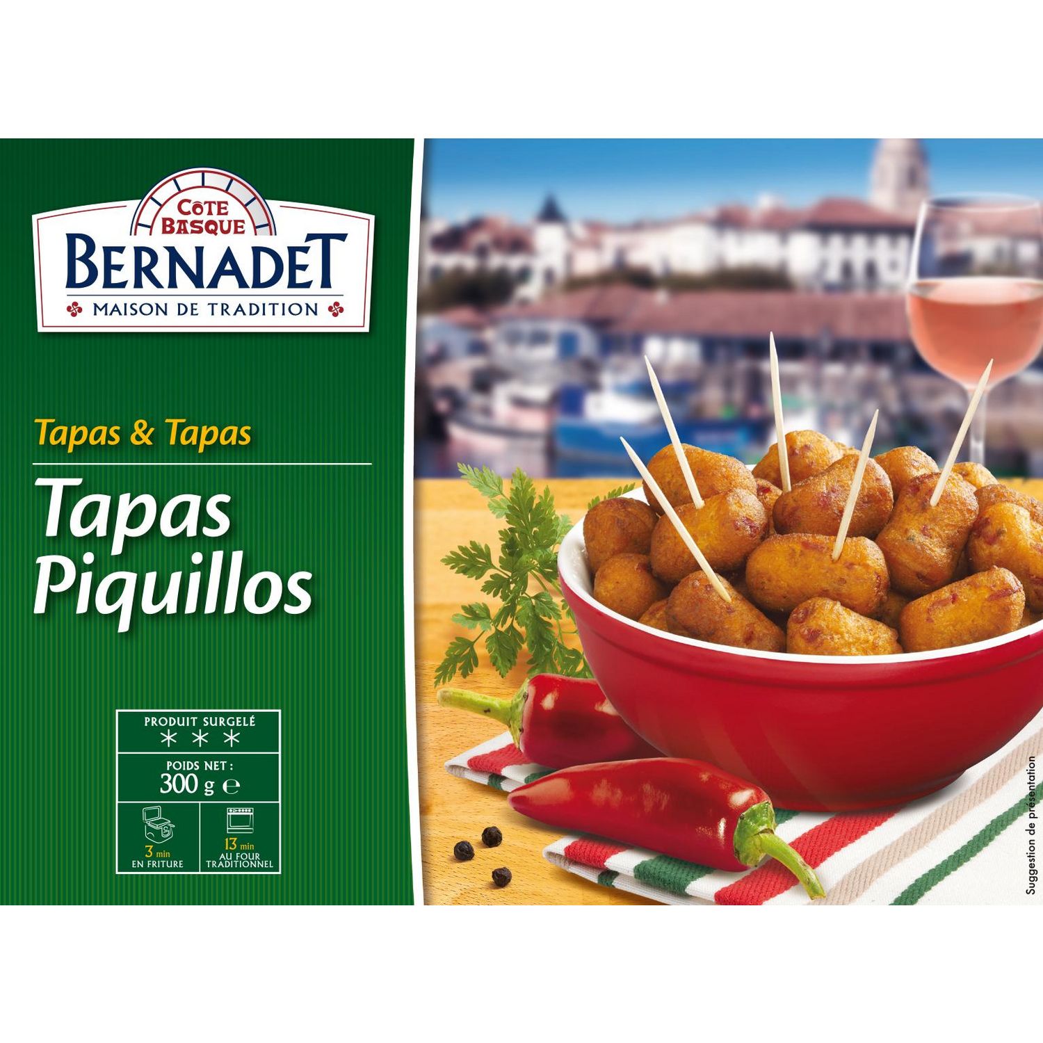 Ingrédients : Eau, piquillos 25.4%, flocon de pomme de terre déshydratée (pomme de terre, émulsifiant : mono et diglycérides d’acides gras, épice : curcuma) 21%, farine de blé 6.5%, blancs d'oeufs 2.5%, oeufs entiers 2.5%, lait en poudre 2.5%, chapelure (blé), sel, ail, sucre, persil, pimenton, poivre, huile de friture (huile de pépins de raisin, huile de tournesol, huile de colza) 2.7%, .