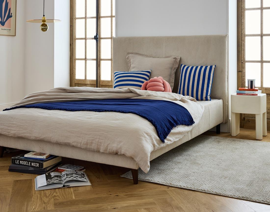 Son revêtement en velours côtelé et ses pieds en bois noyer apporteront de la chaleur et de la modernité à votre chambre.