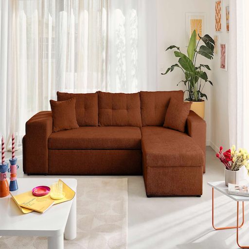 Grâce à sa fonction réversible, la méridienne de ce canapé d'angle peut se placer à gauche ou à droite et s'adapte ainsi à toutes vos envies d'aménagement. De plus, le canapé California est équipé d'un coffre de rangement situé sous sa méridienne et d'une étagère de rangement en bois intégrée dans un de ses accoudoirs. Ce canapé est également doté d'une fonction convertible vous offrant ainsi un espace de couchage occasionnel de 194x130 cm.