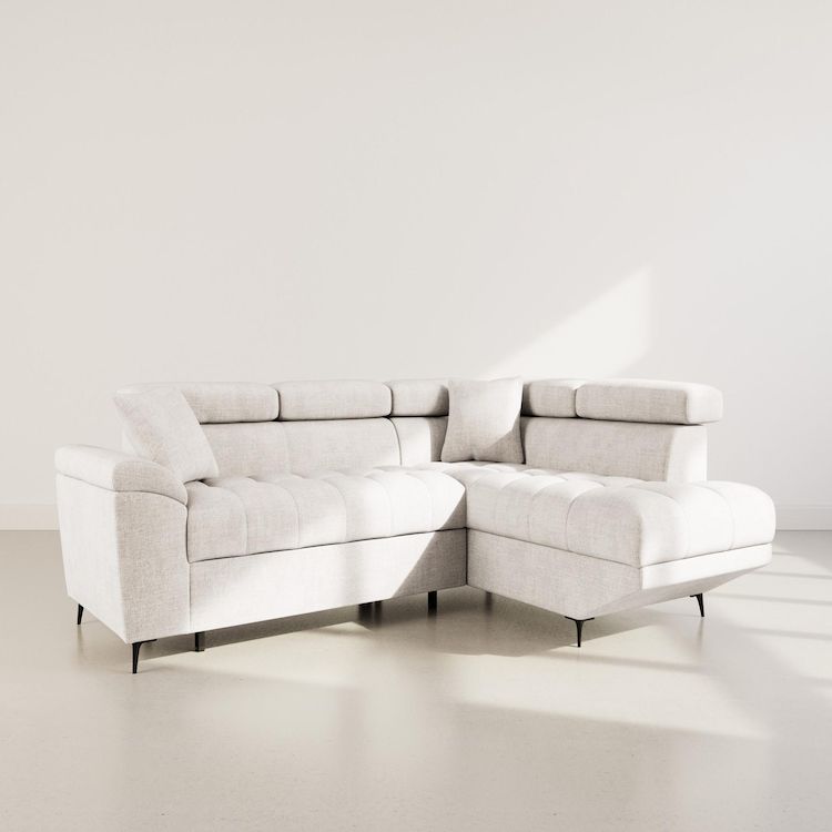 Camille - canapé d'angle droit 5 places convertible avec têtières et coffre en velours texturé