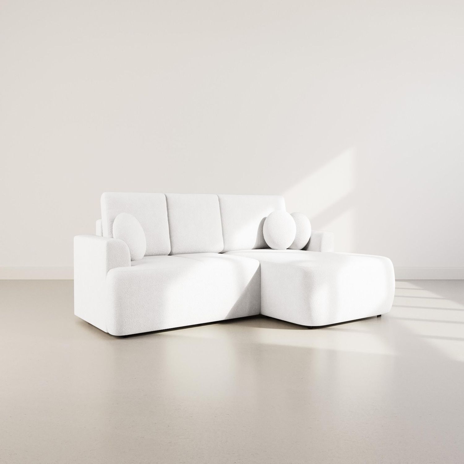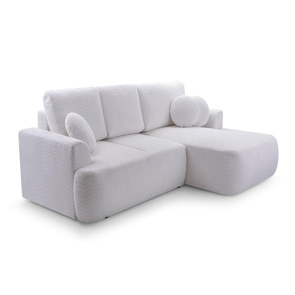 Avec le canapé d'angle droit Candela, c'est toute la définition du confort que vous allez revoir. Conçu pour accueillir jusqu'à quatre personnes, ce meuble d'angle est parfait pour se détendre ou profiter de moments conviviaux. Sa structure robuste et ses coussins moelleux vous garantissent un soutien optimal. Son tissu bouclette doux est très agréable au toucher et illumine votre décoration intérieure. Chaque assise est soigneusement rembourrée pour vous offrir une expérience agréable et prolongée, même devant un film en version longue. Sa conception élégante et moderne s'intègre parfaitement dans tout type d'intérieur. Les coussins ronds décoratifs inclus ajoutent une touche de style et de confort supplémentaires.
