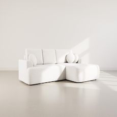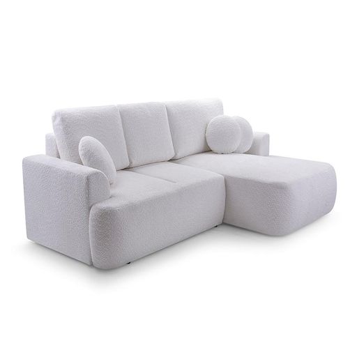 - Présentation de la collection : A la fois tendance par son revêtement en tissu bouclette et confortable grâce à ses coussins moelleux, le canapé d'angle Candela est également doté d'une fonction convertible et d'un coffre de rangement.