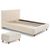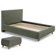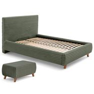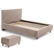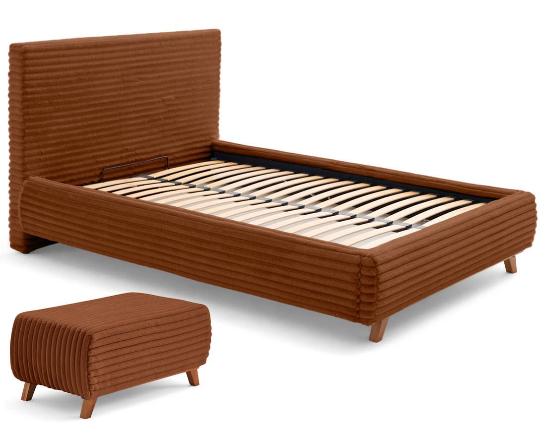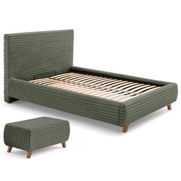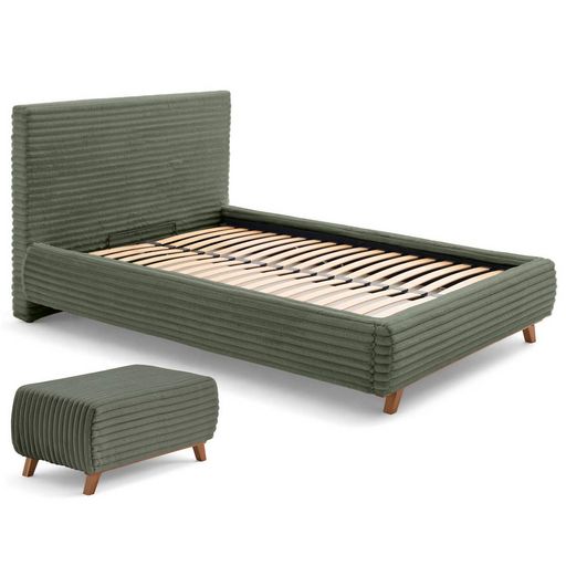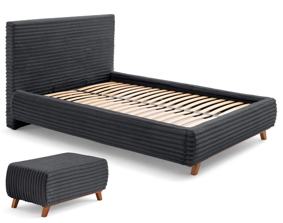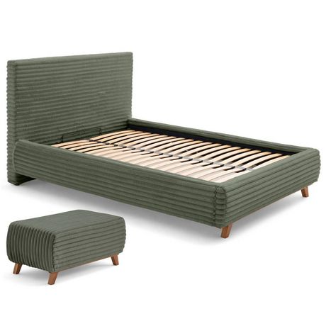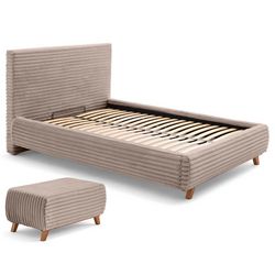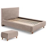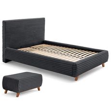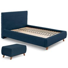 - Détail des matières : Matières principales : Bois massif et panneaux de particules - Revêtement en fausse fourrure côtelé – Pieds en hêtre massif – Coffre de rangement intégré – Bout de lit modulable